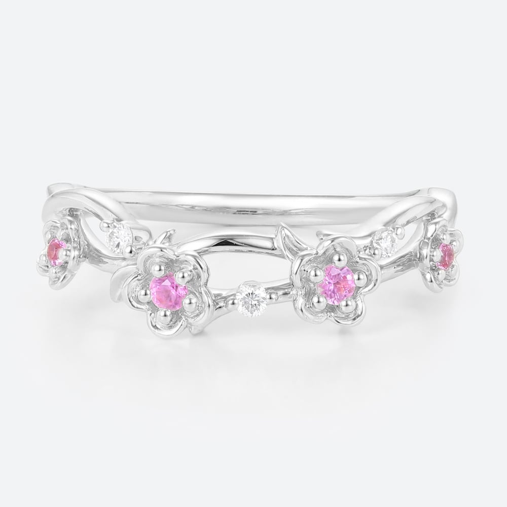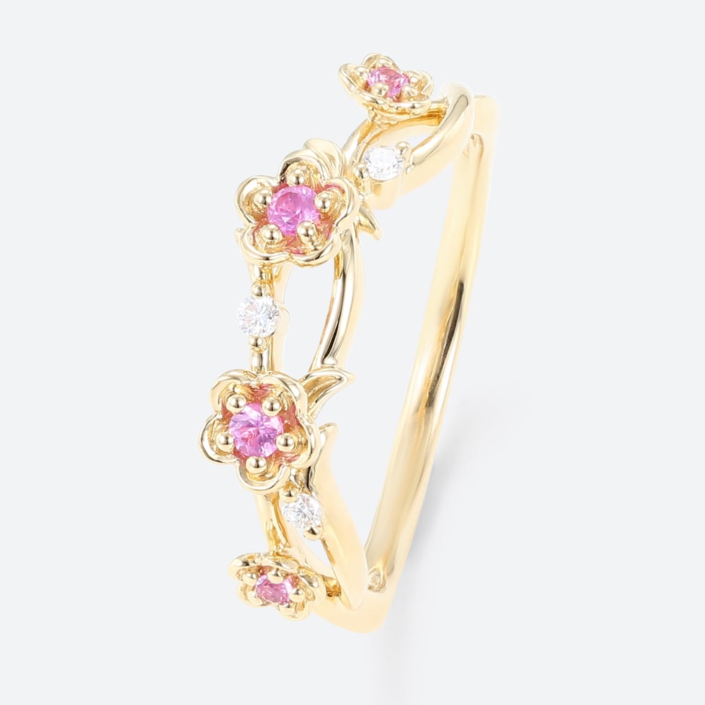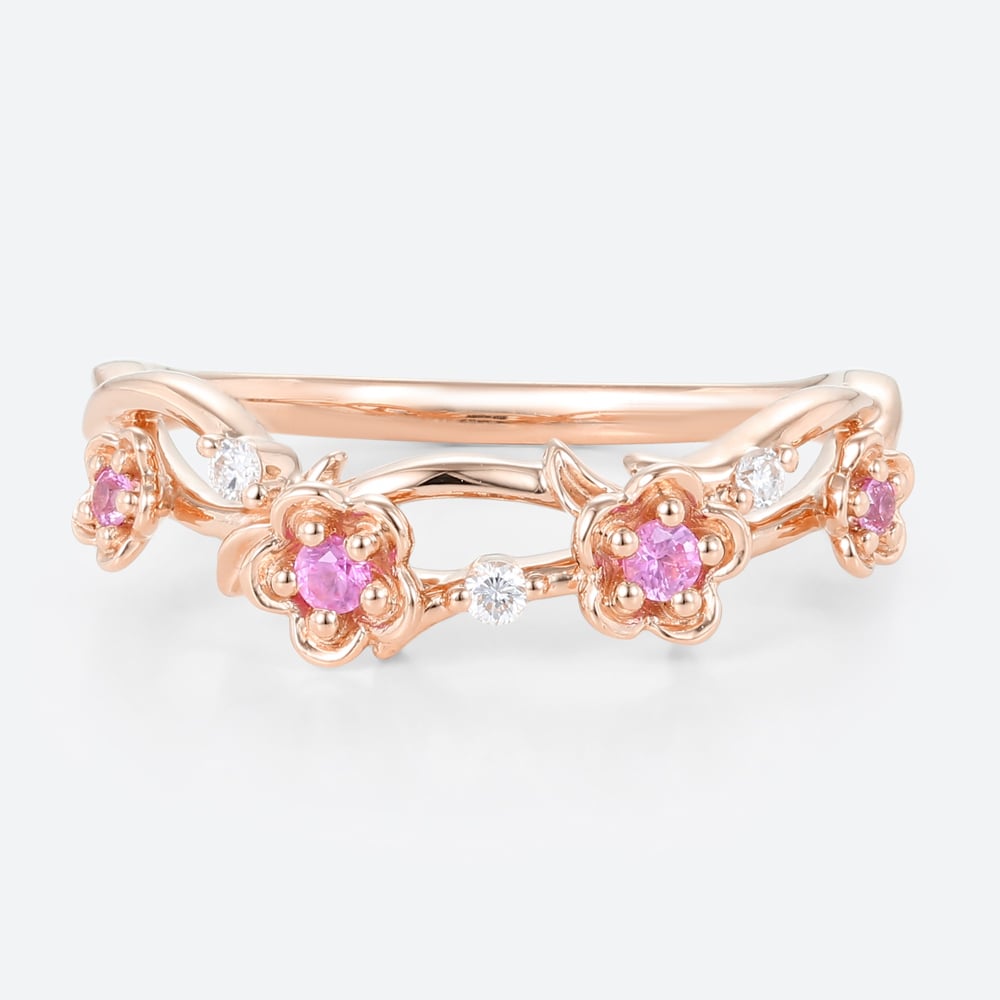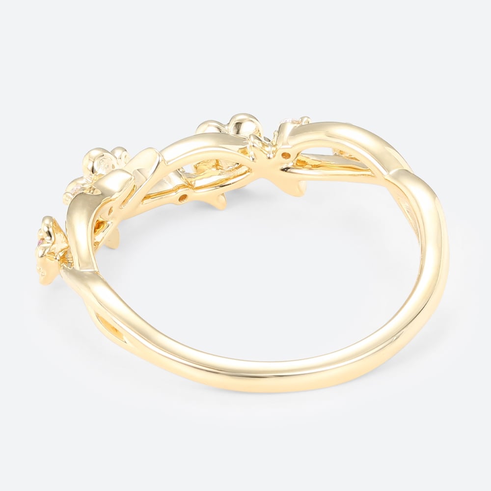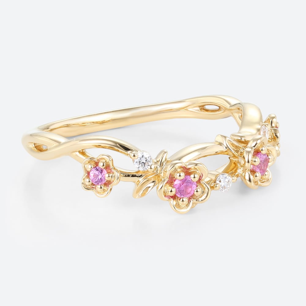 0.14ctw Round Cut Pink Sapphire Delicate Flower Stackable Wedding Band in Yellow Gold