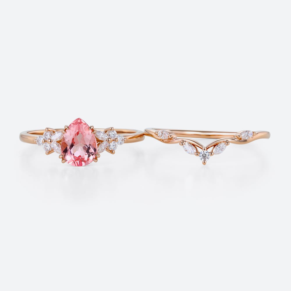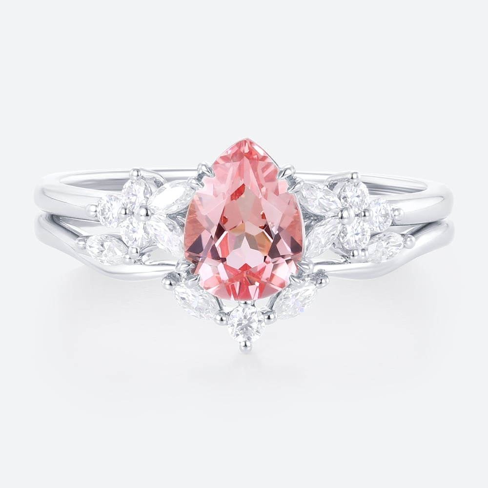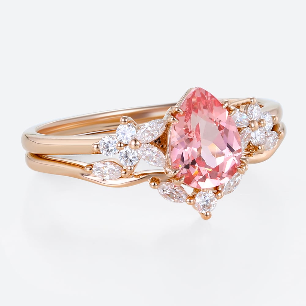 Pear Cut Pink Sapphire Floral Engagement Ring with Curved Wedding Ring Set in Rose Gold