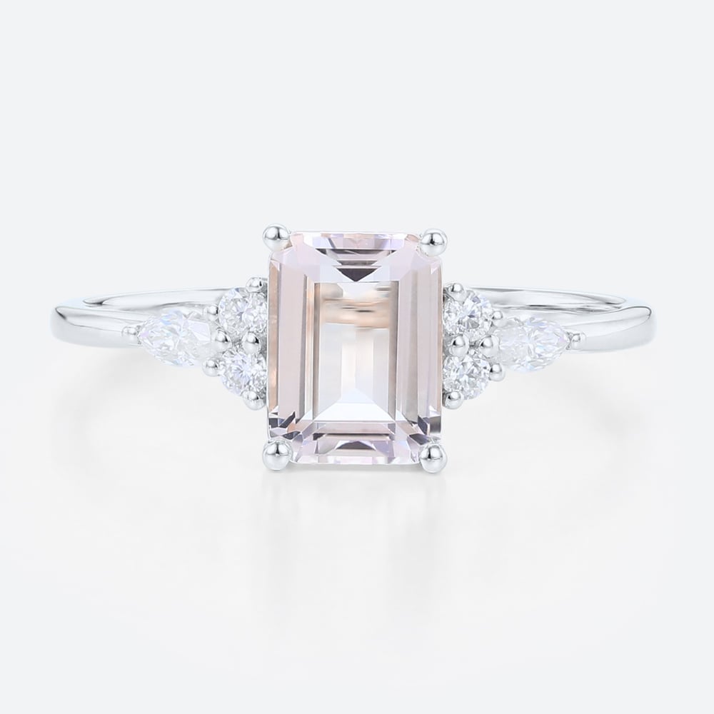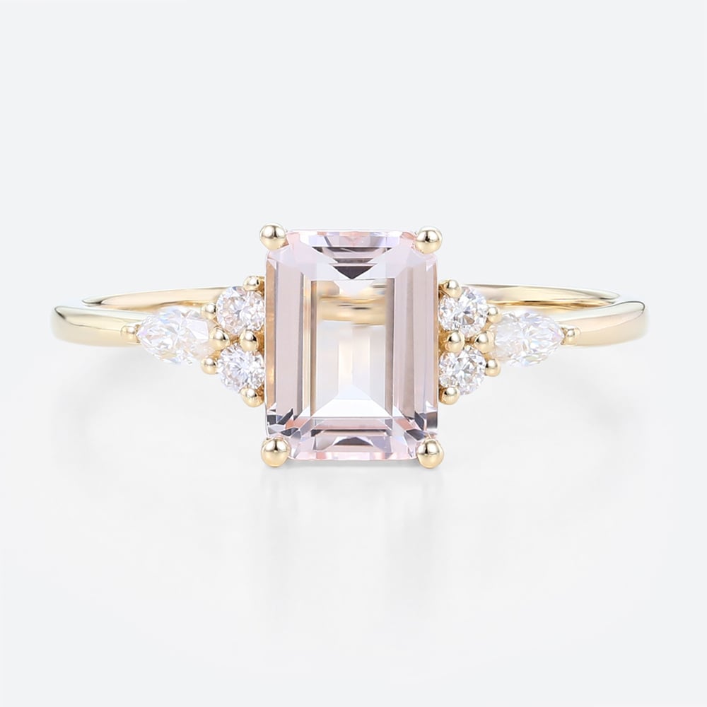 Emerald Cut Morganite Engagement Ring Cluster Bridal Ring in Yellow Gold