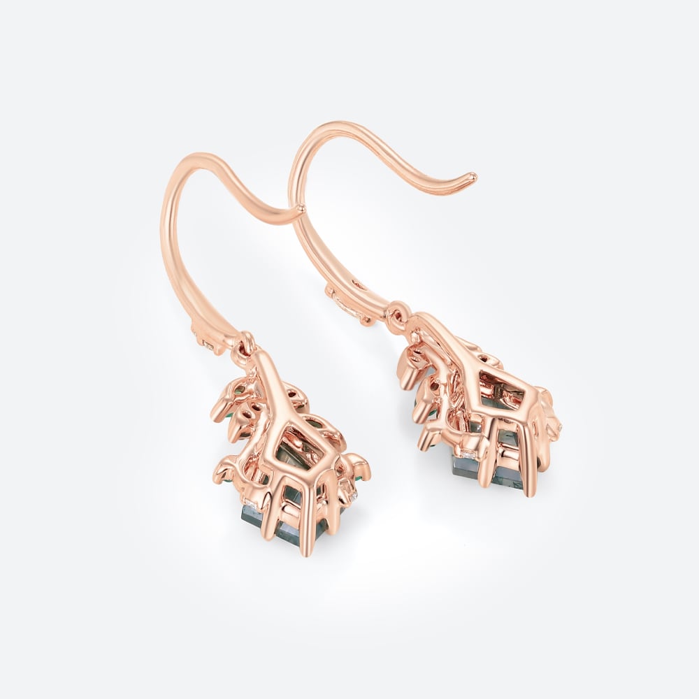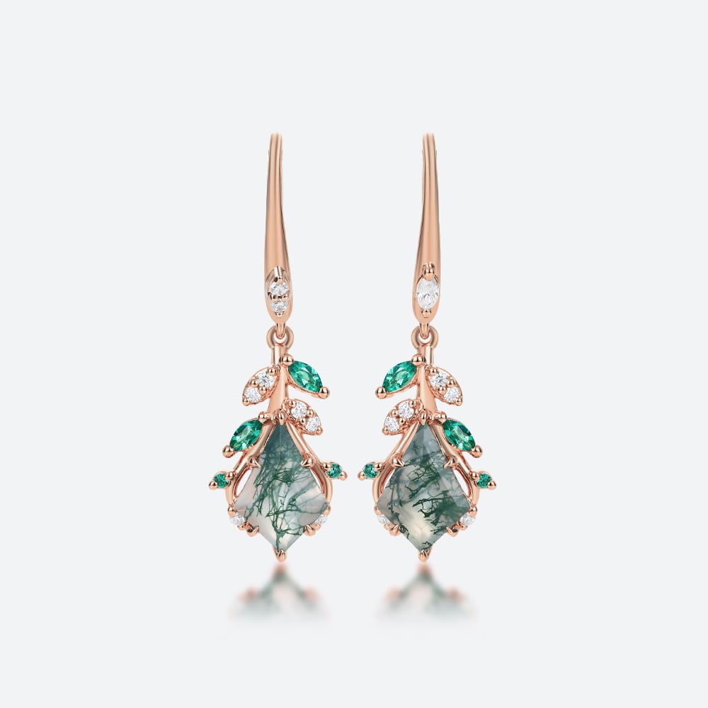 Kite Cut Moss Agate Drop Earrings with Leaf & Bud Accents in Rose Gold