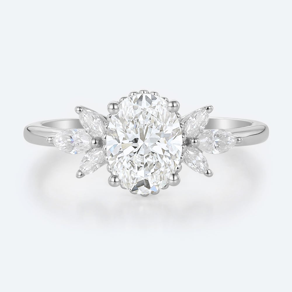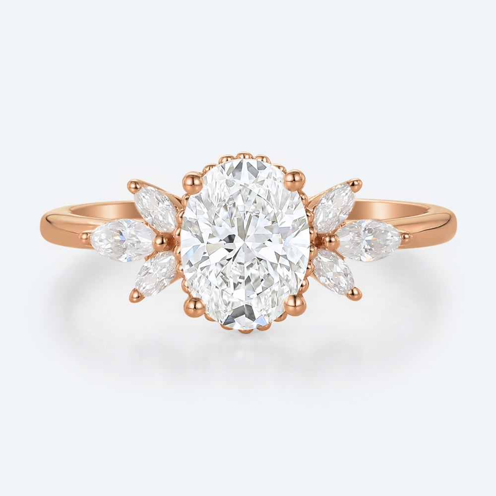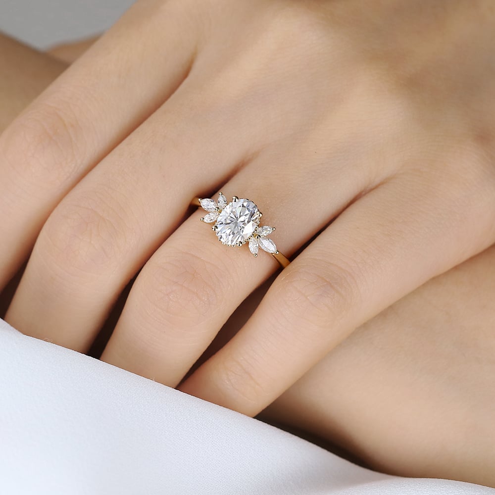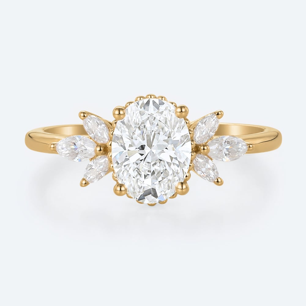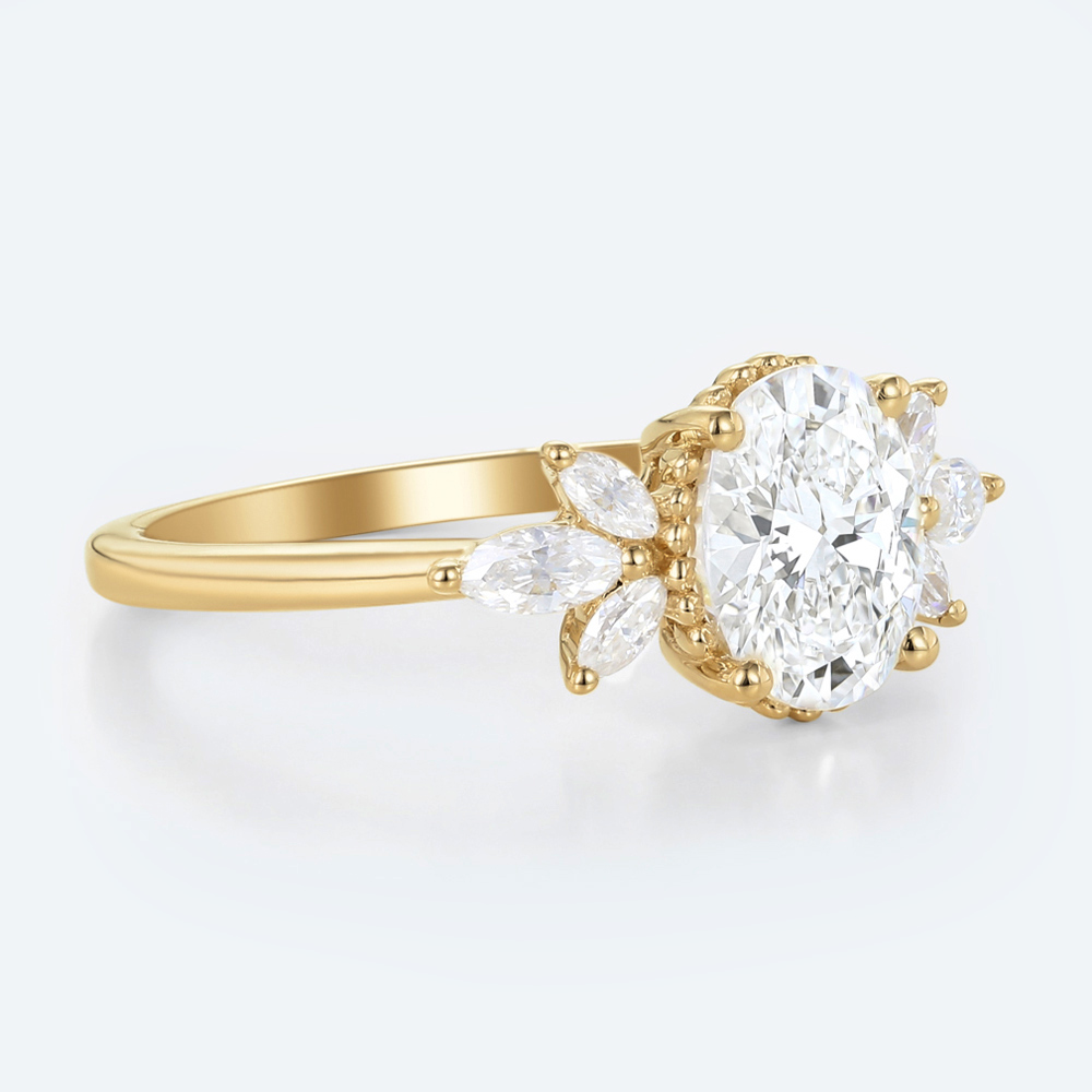 Oval Cut Lab Grown Diamond Art Deco Floral Cluster 4-Prong Engagement Ring in Yellow Gold