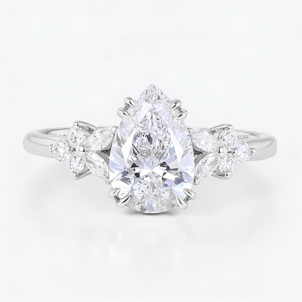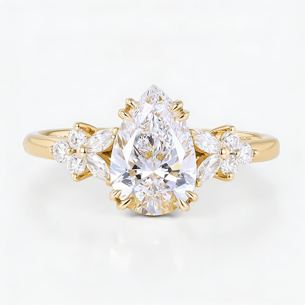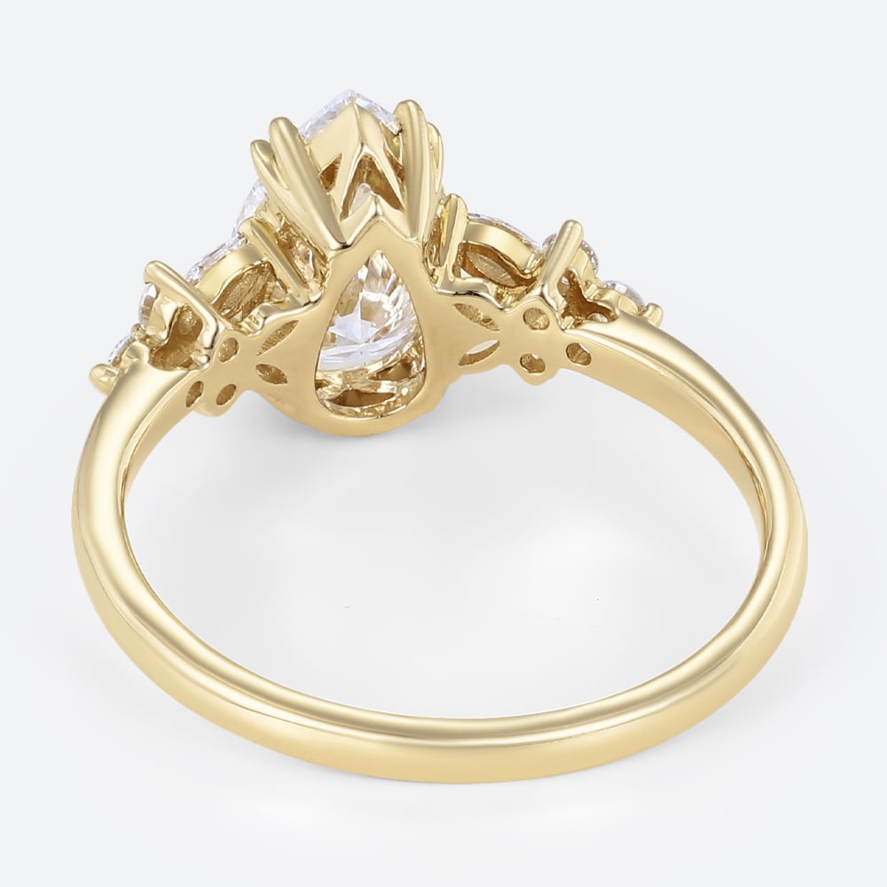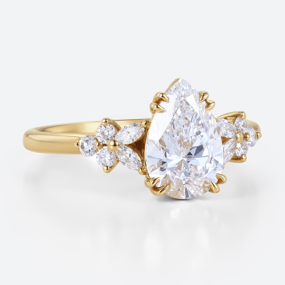 Pear Shaped Lab Grown Diamond Petal Side Stones Double Claw Prong Engagement Ring in Yellow Gold