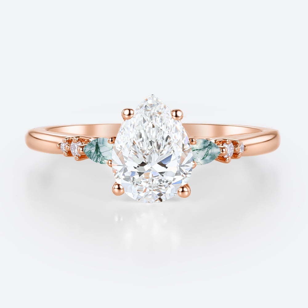Rose Gold Pear Shaped Moss Agate Ring Marquise Moissanite Side Stone Simple Engagement Ring