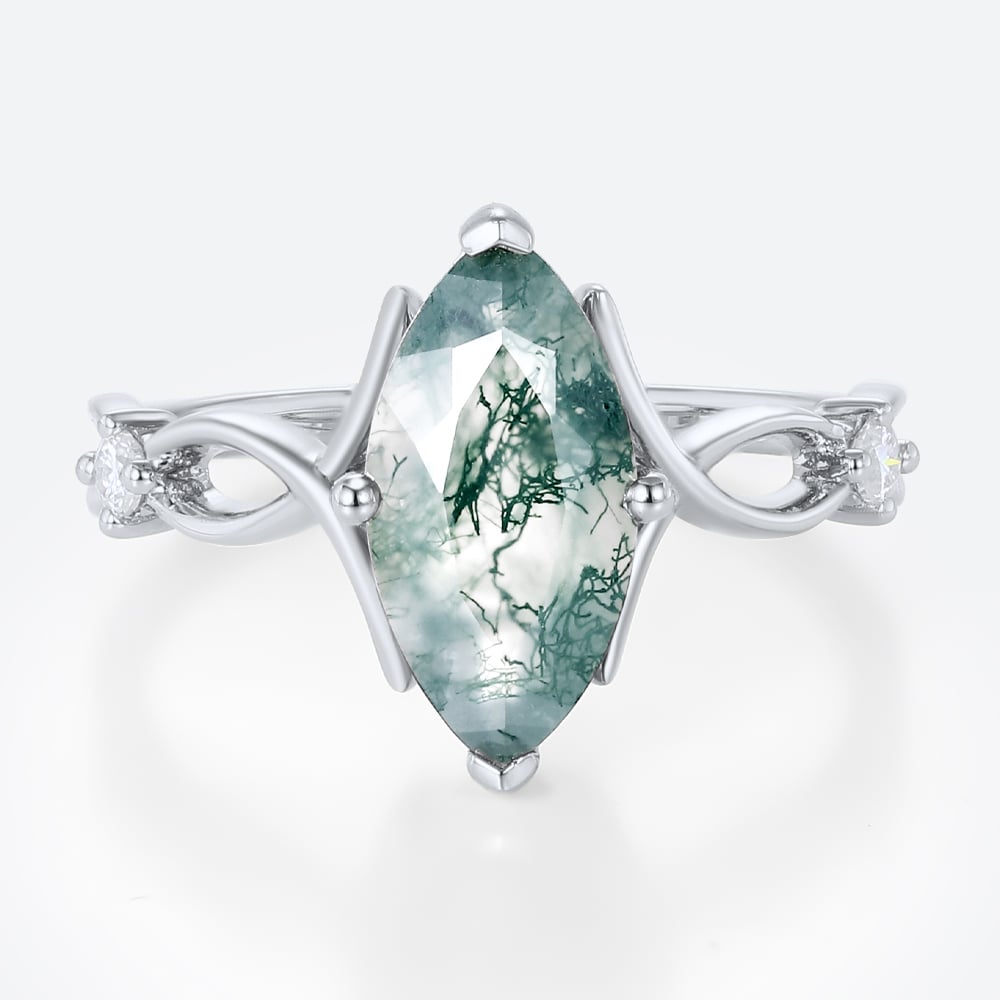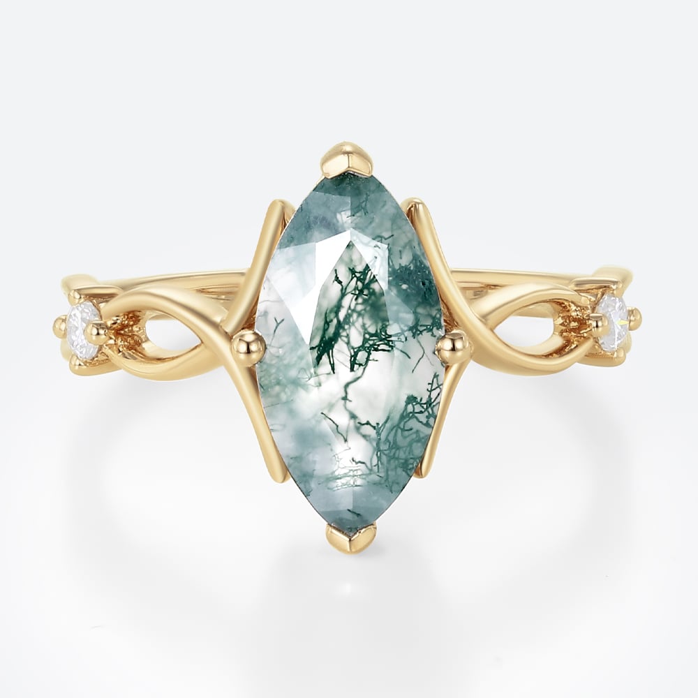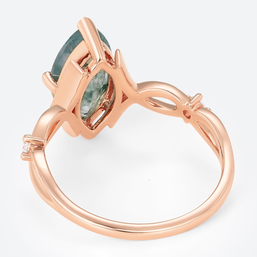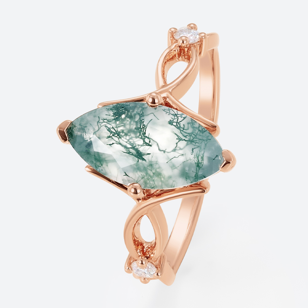 Marquise Cut Moss Agate Three Stone Engagement Ring with Ribbon-Style Detail in Rose Gold