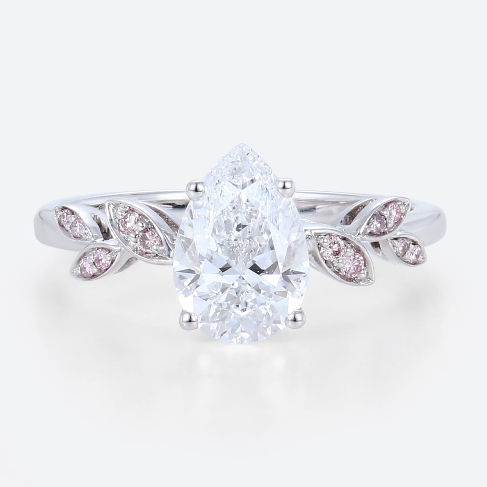 1ct Colorless VS+ Pear Cut Lab Grown Diamond Nature-Inspired Navette 4 Prong Engagement Ring in White Gold