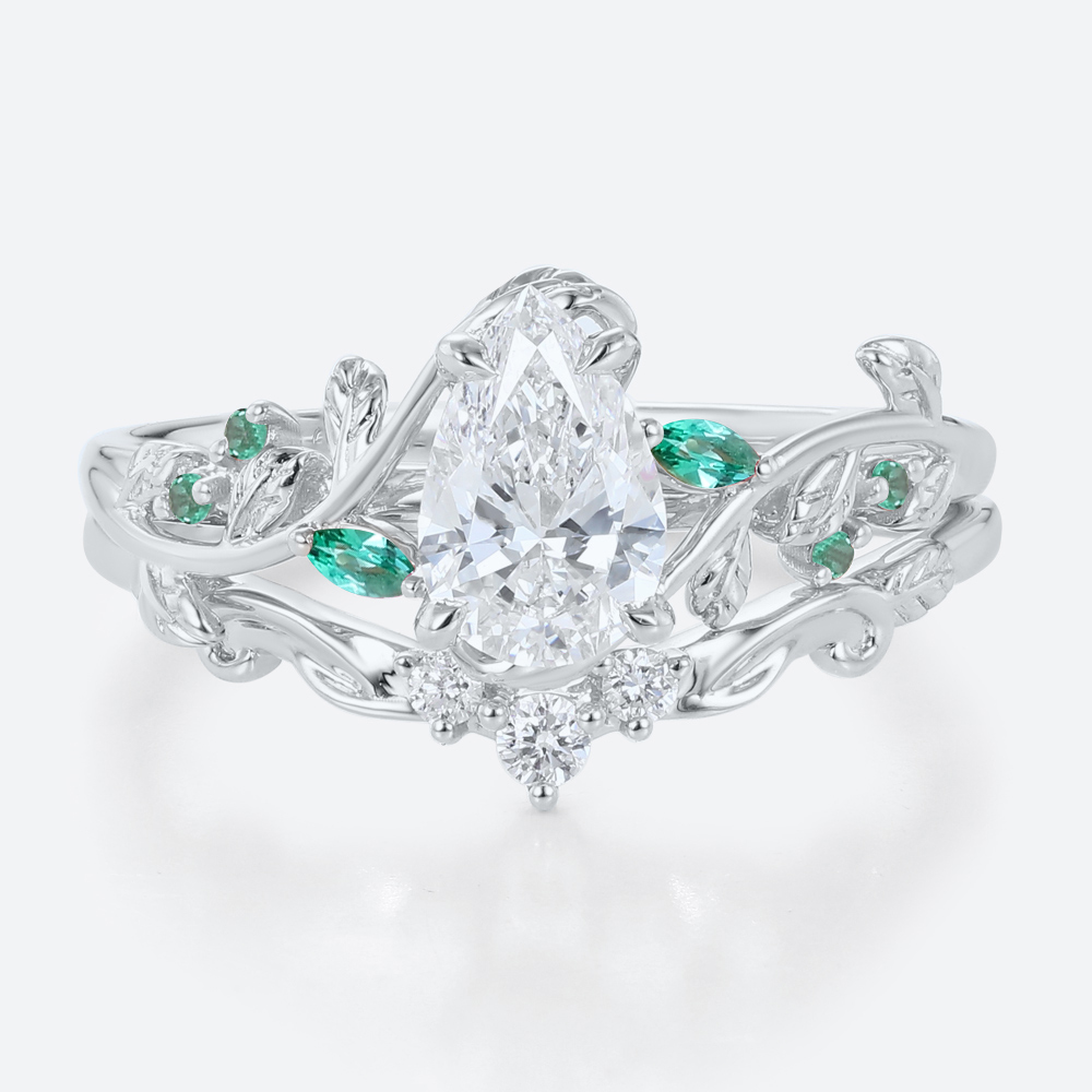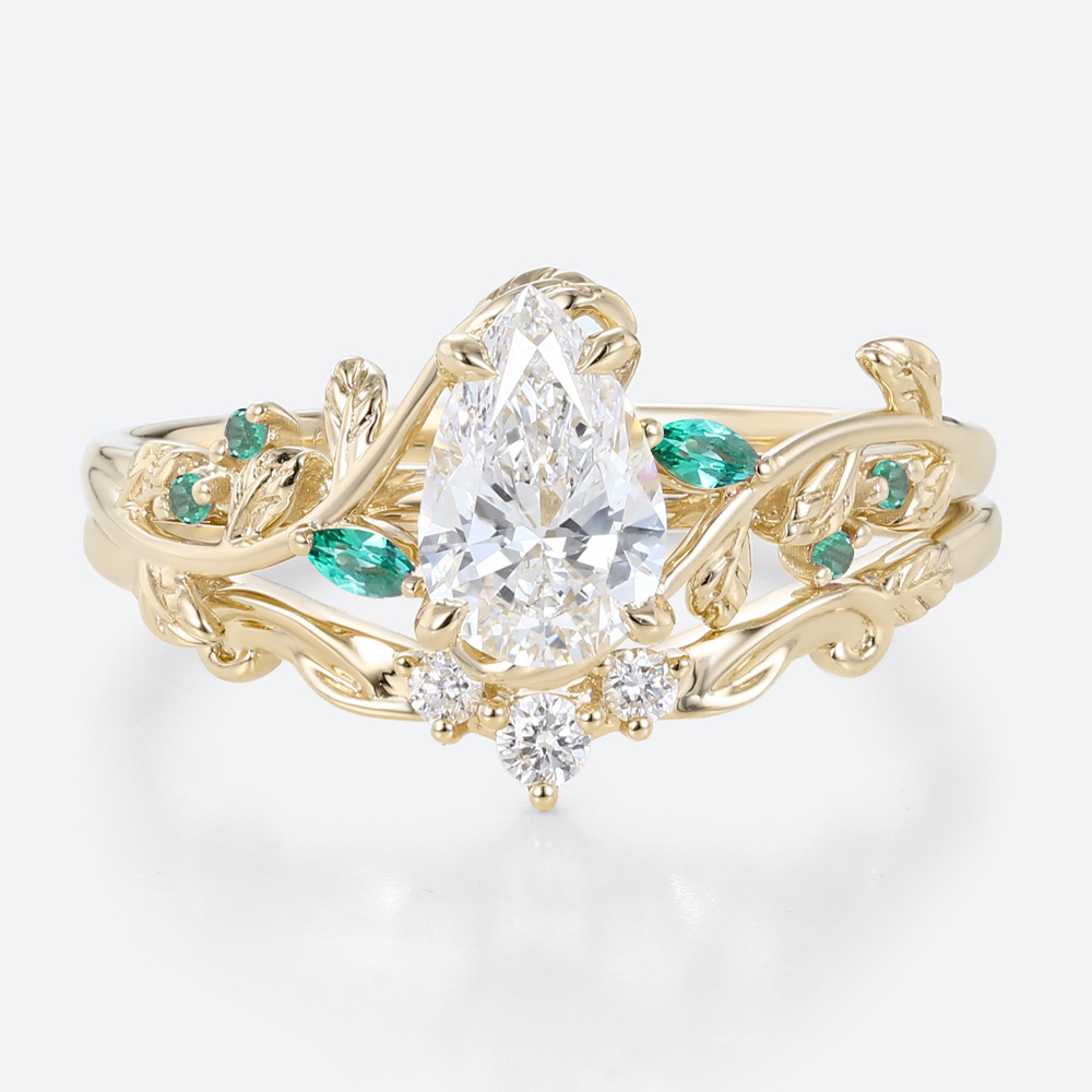 1ct Colorless VS+ Pear Cut Lab Grown Diamond Nature-Inspired 4 Claw Prong Bridal Ring Set in Rose Gold