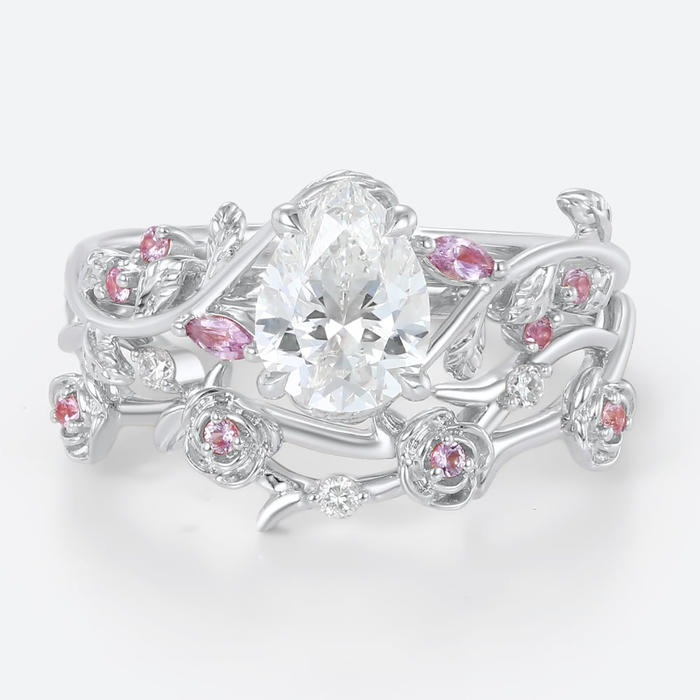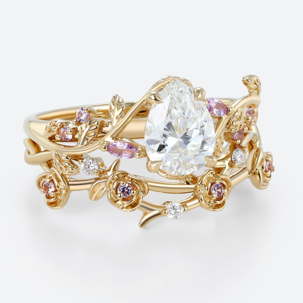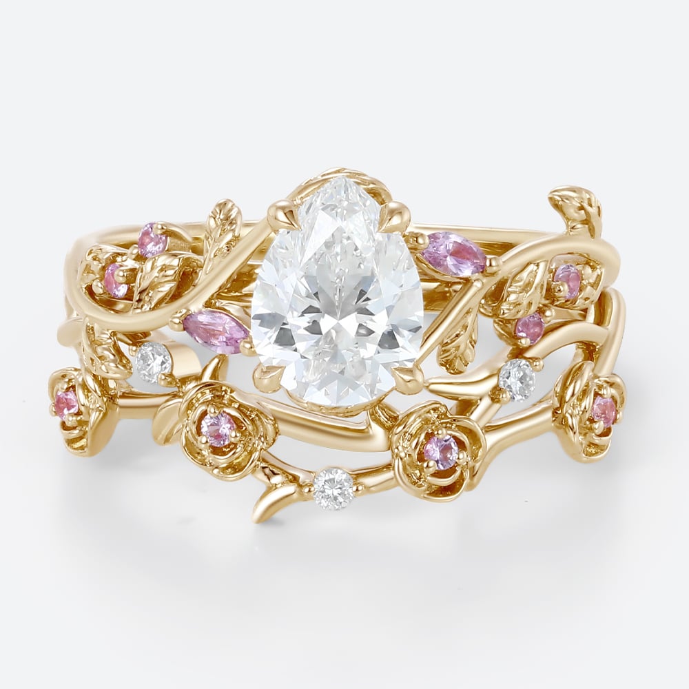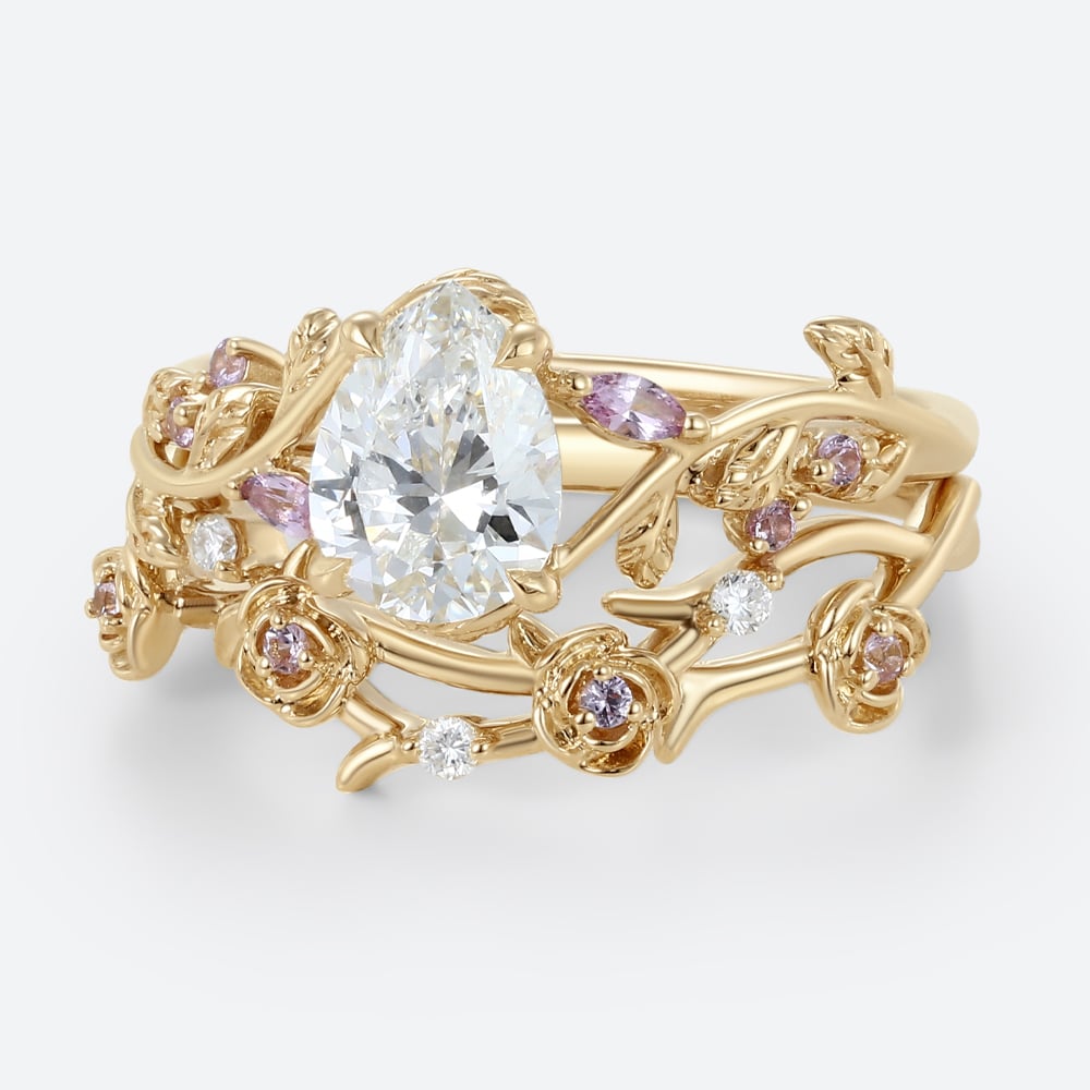 1ct Colorless VS+ Pear Shaped Lab Grown Diamond Ornate Rose Vine 4 Claw Prong Engagement Ring Set in Yellow Gold