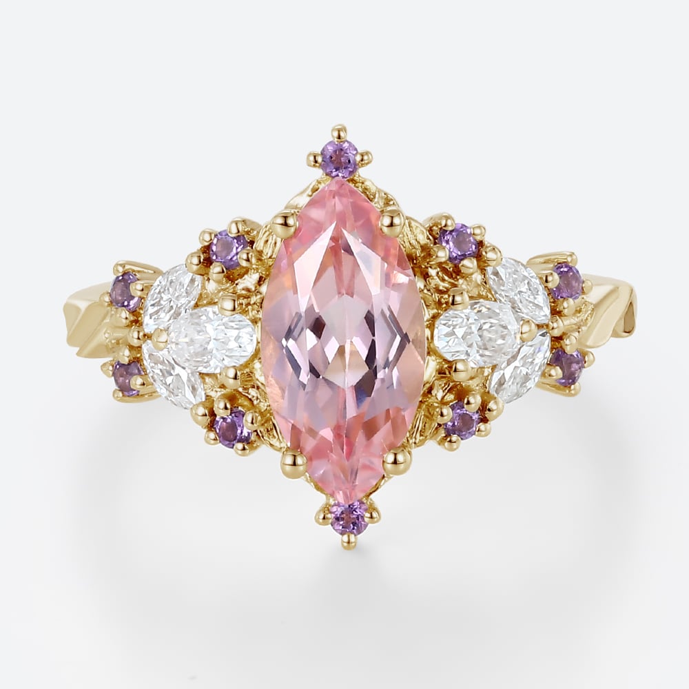 Rose Gold Pear Shaped Black Rutilated Quartz Ring Marquise Cut Diamond Side Stone Engagement Ring