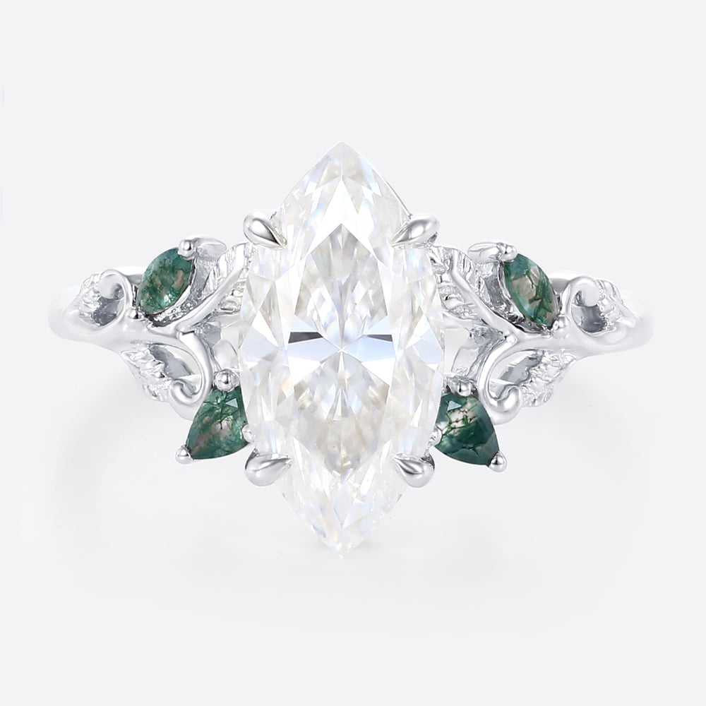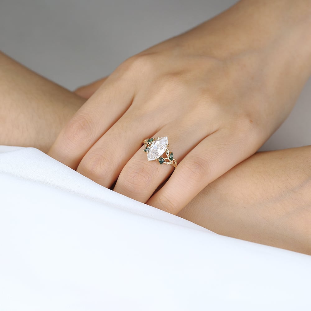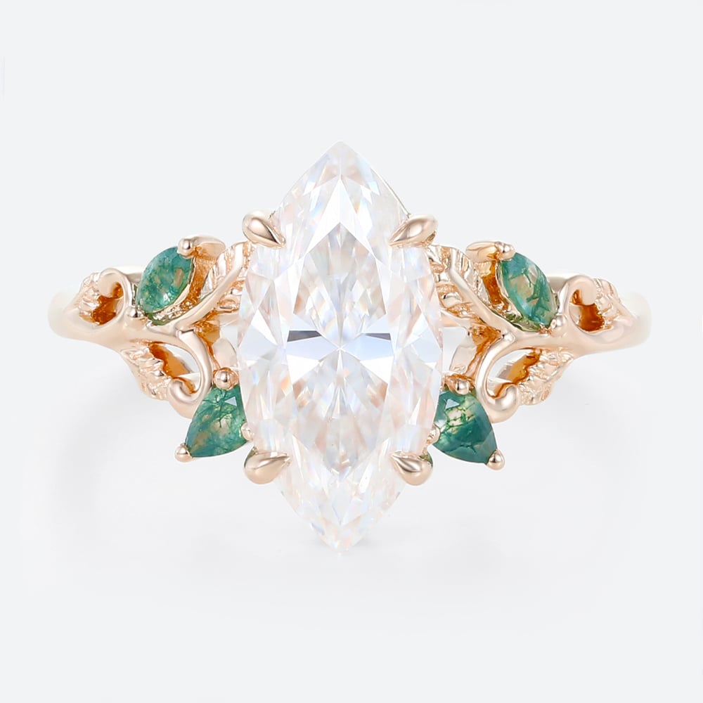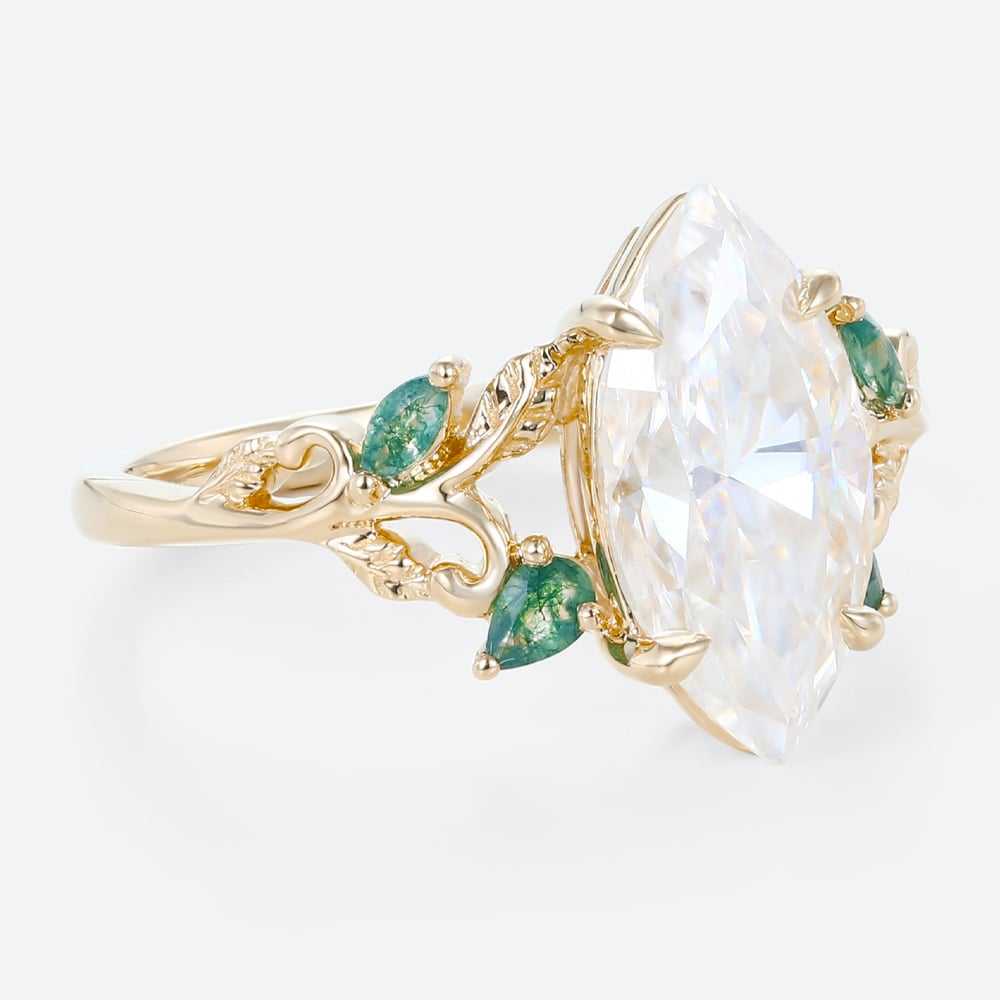 Marquise Cut Moissanite Engagement Rings with Scrollwork Leaf Accents in Yellow Gold