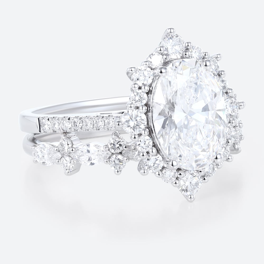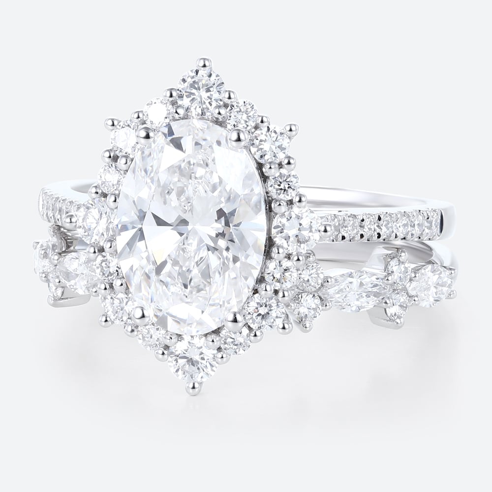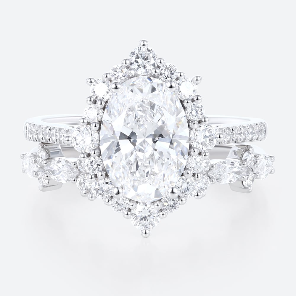 2ct Colorless VS+ Oval Cut Lab Grown Diamond Graduated Halo 4-Prong Bridal Ring Set in White Gold