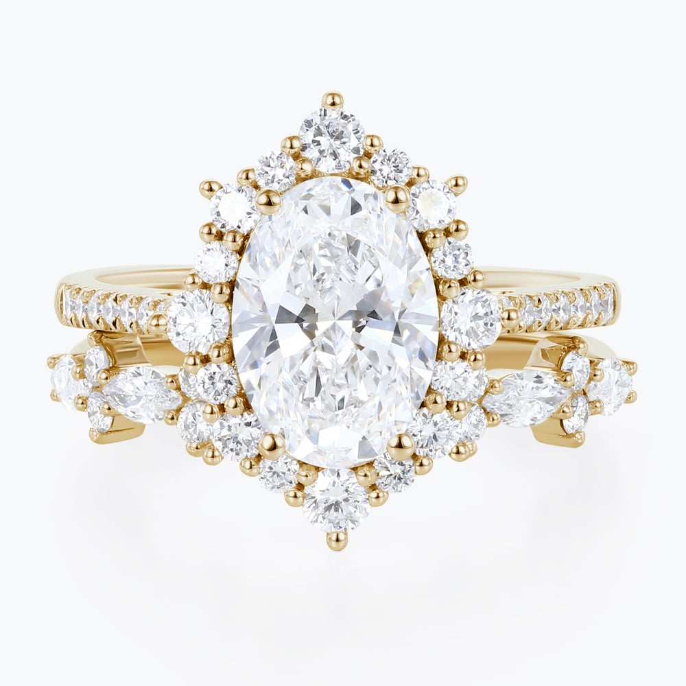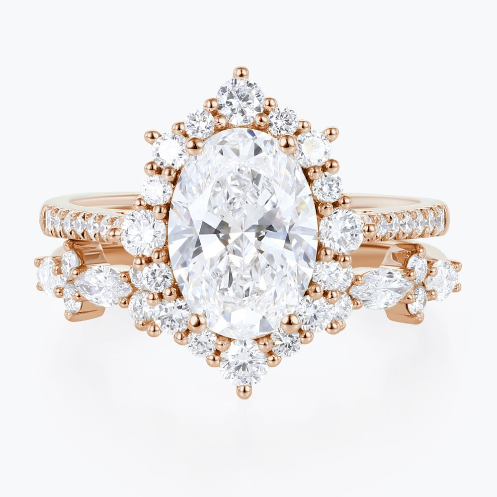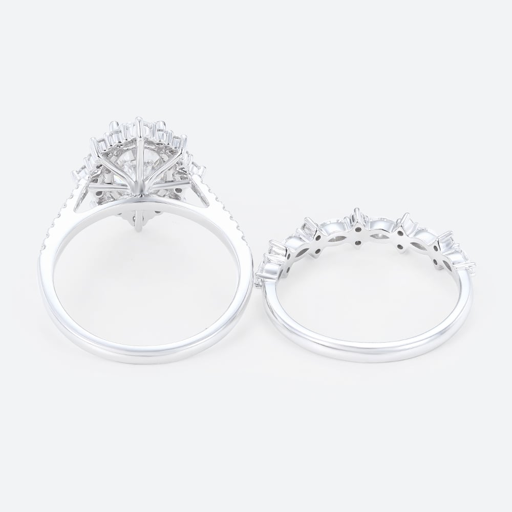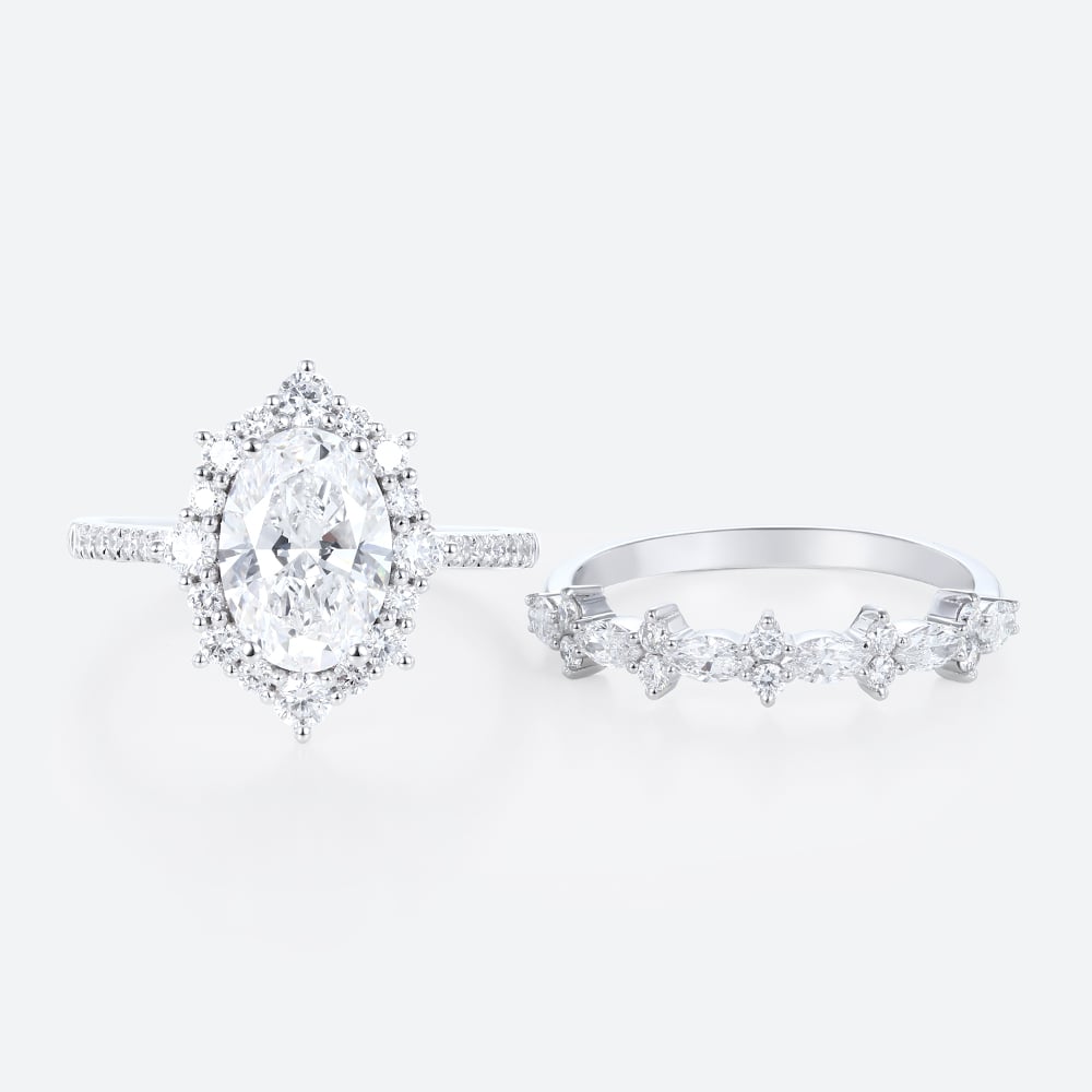 2ct Colorless VS+ Oval Cut Lab Grown Diamond Graduated Halo 4-Prong Bridal Ring Set in White Gold