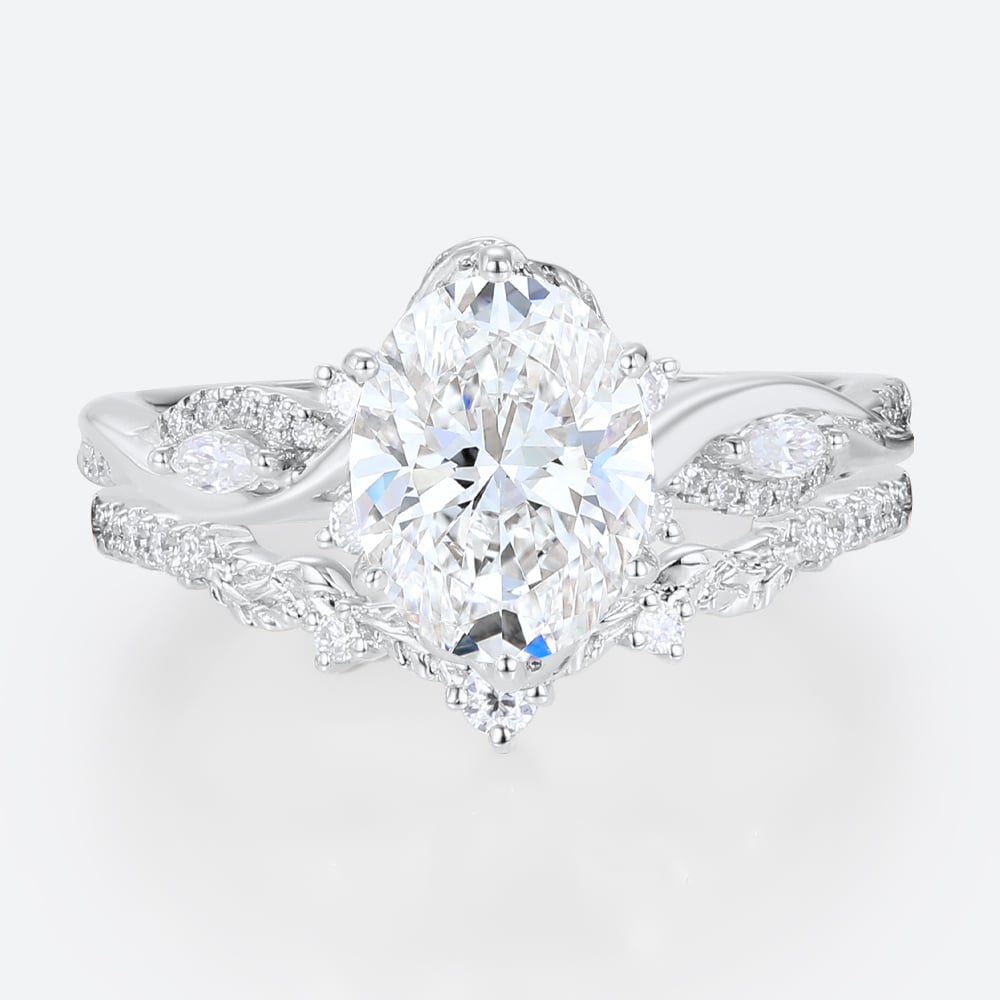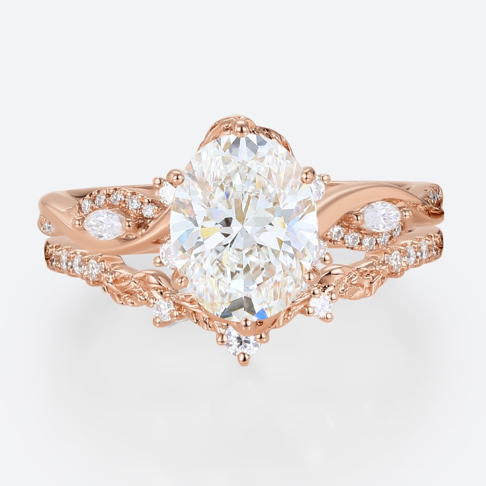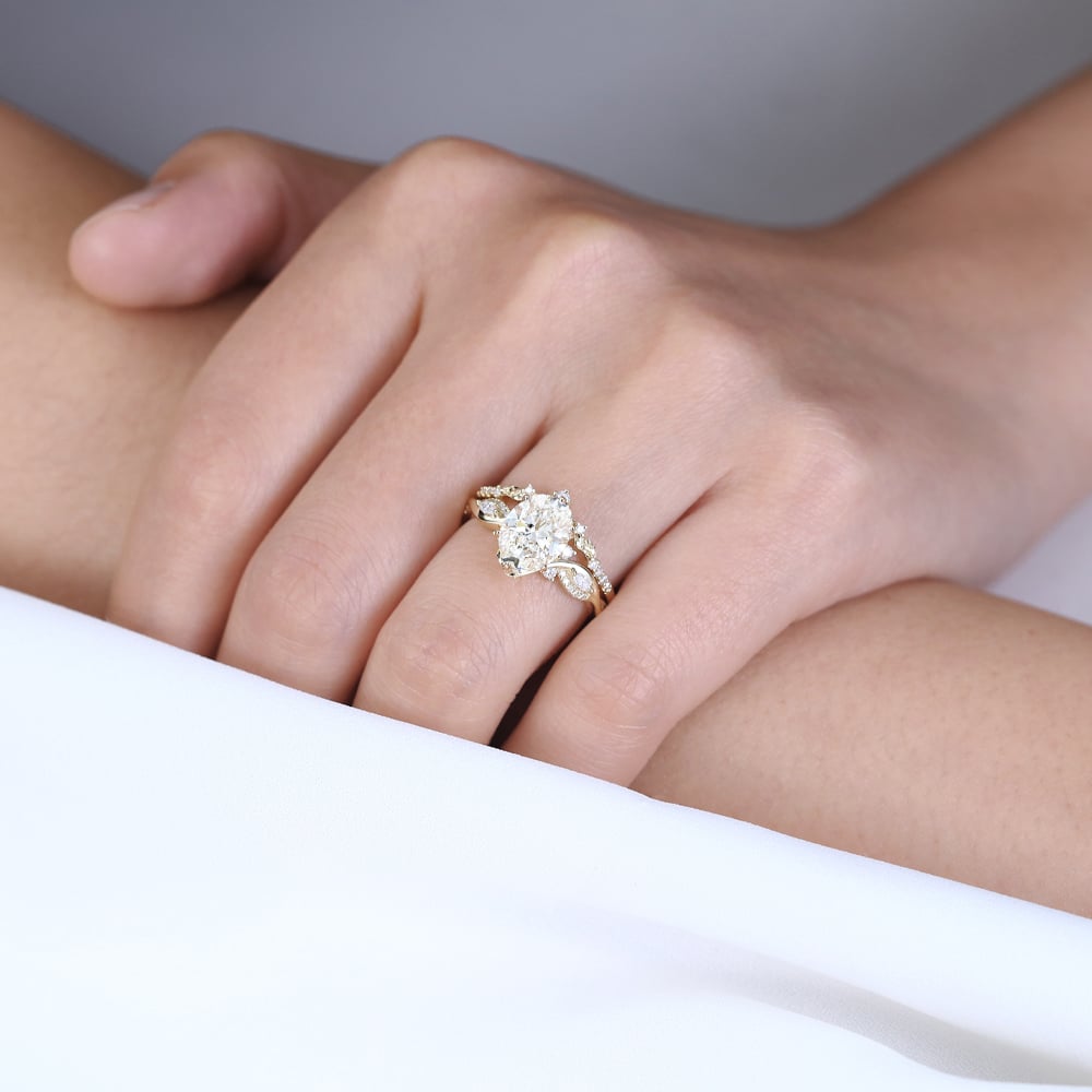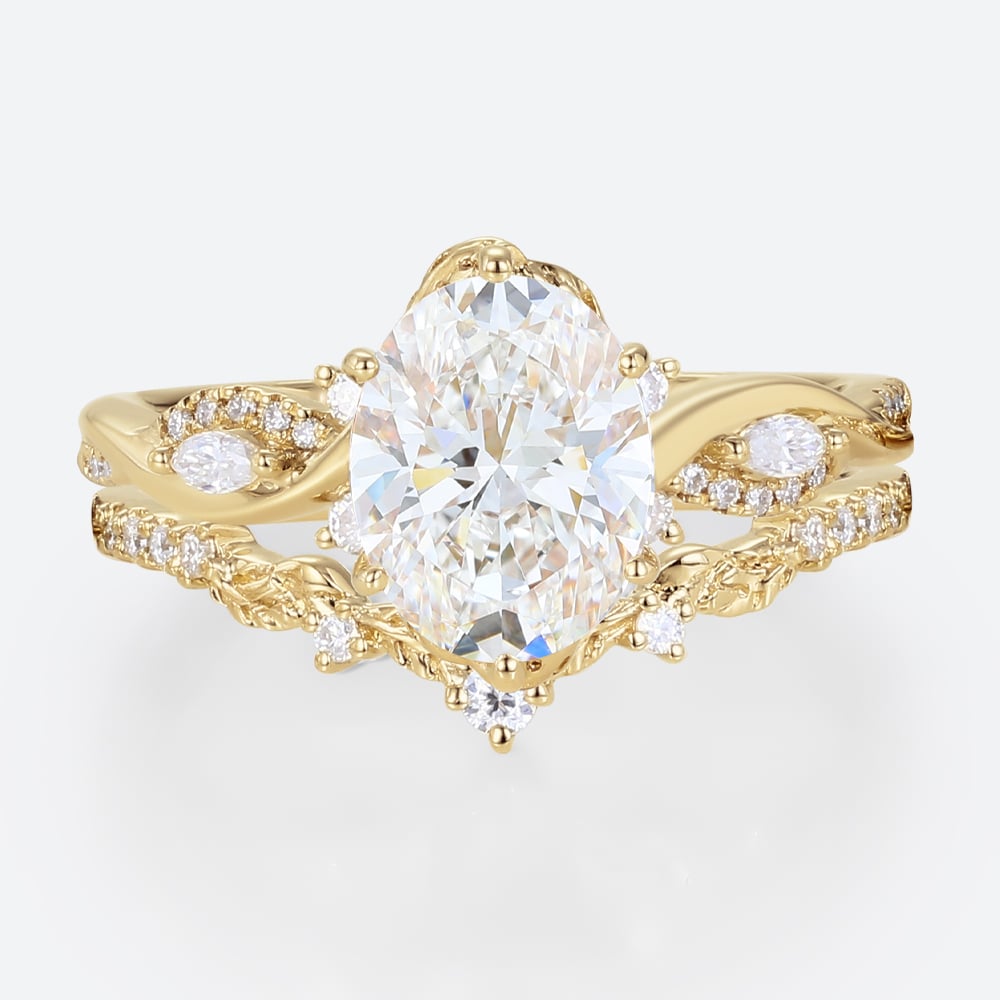 2ct Colorless VS+ Oval Cut Lab Grown Diamond Vine-Inspired 6-Prong Bridal Ring Set in Yellow Gold