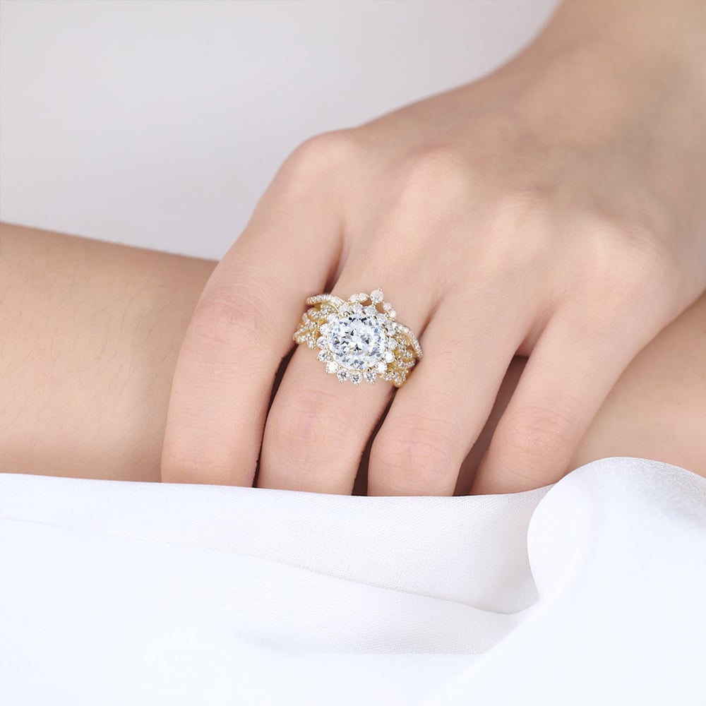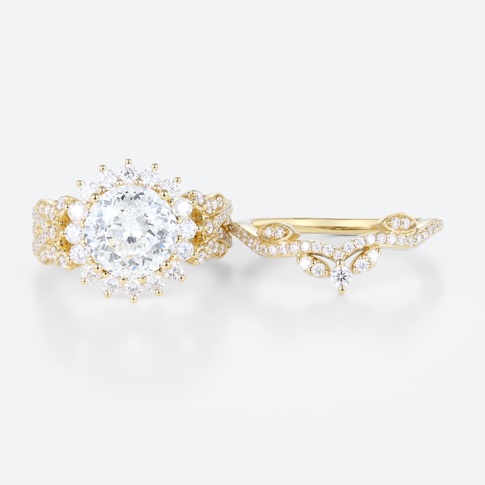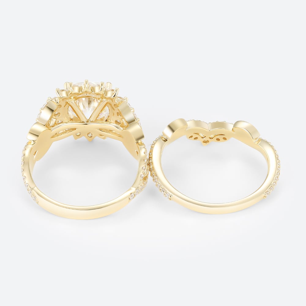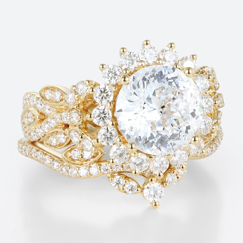 2ct Colorless VS+ Round Cut Lab Grown Diamond Luxury Floral Halo 4-Claw Prong Bridal Ring Set in Yellow Gold
