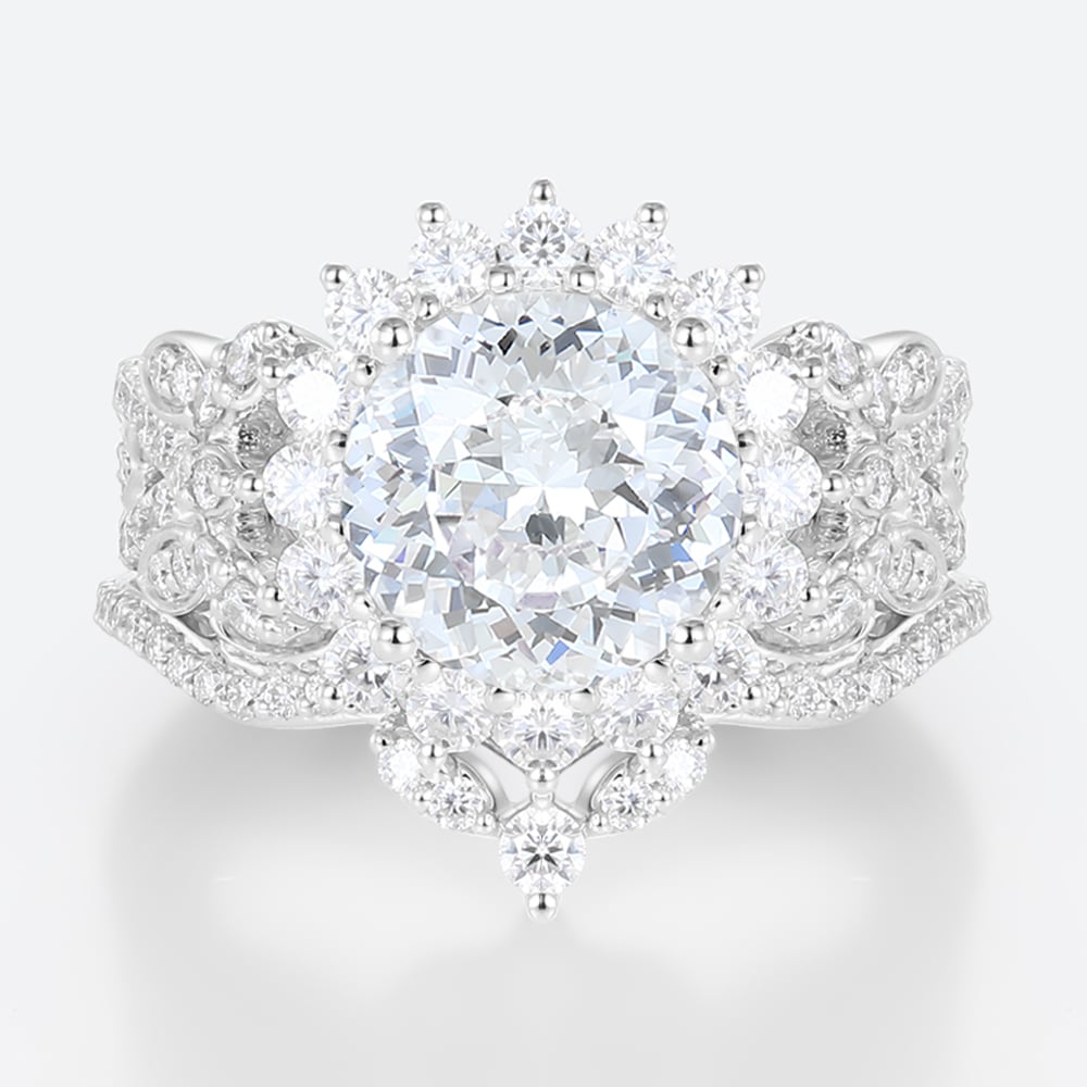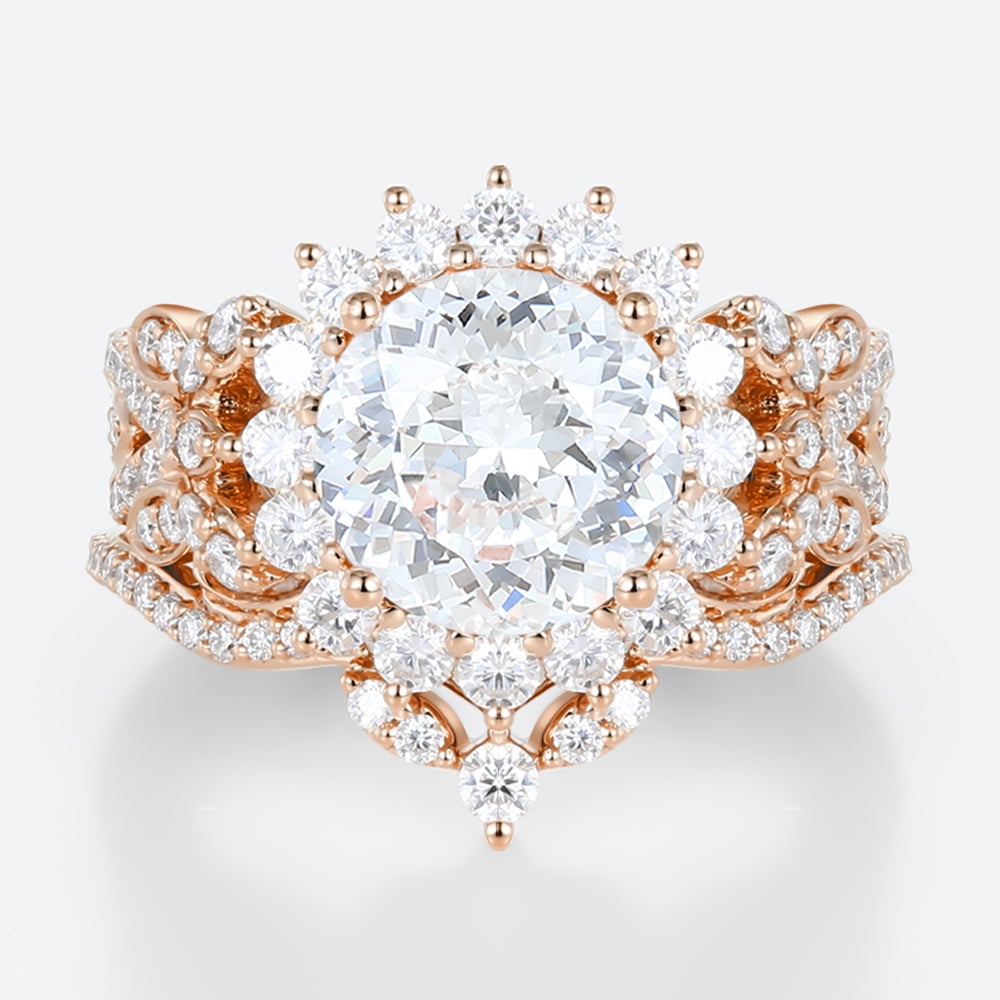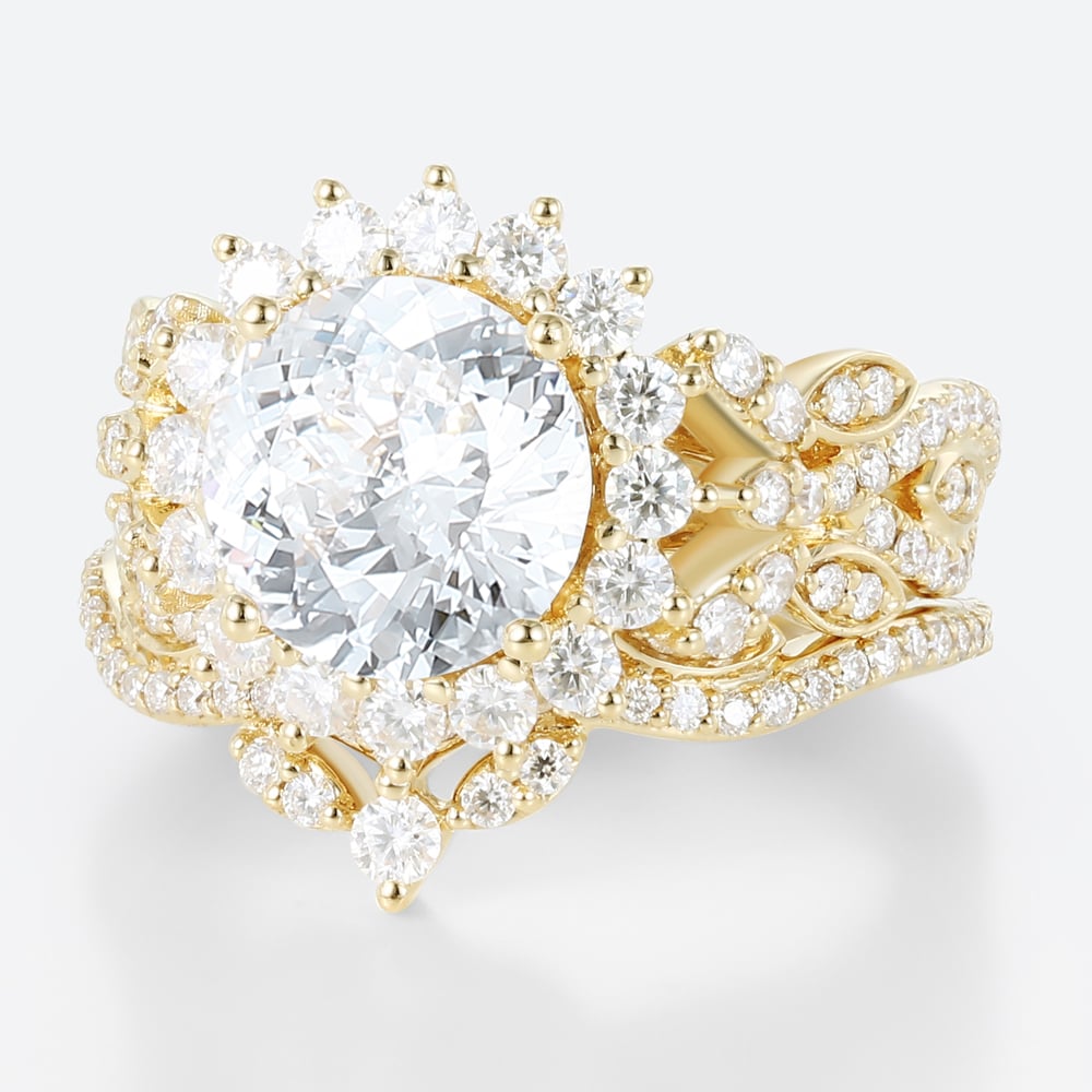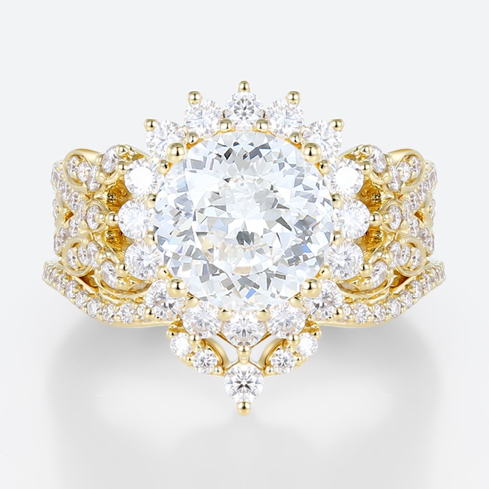 2ct Colorless VS+ Round Cut Lab Grown Diamond Luxury Floral Halo 4-Claw Prong Bridal Ring Set in Yellow Gold