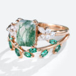2PCS Emerald Cut Moss Agate Engagement Ring With Emerald Petal Shape Wedding Ring Set