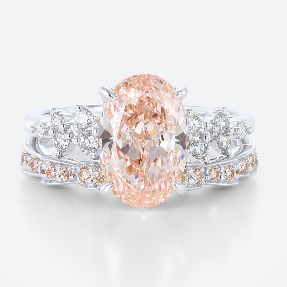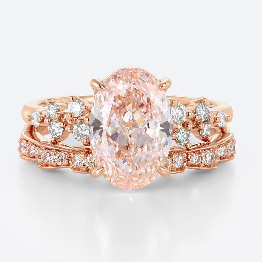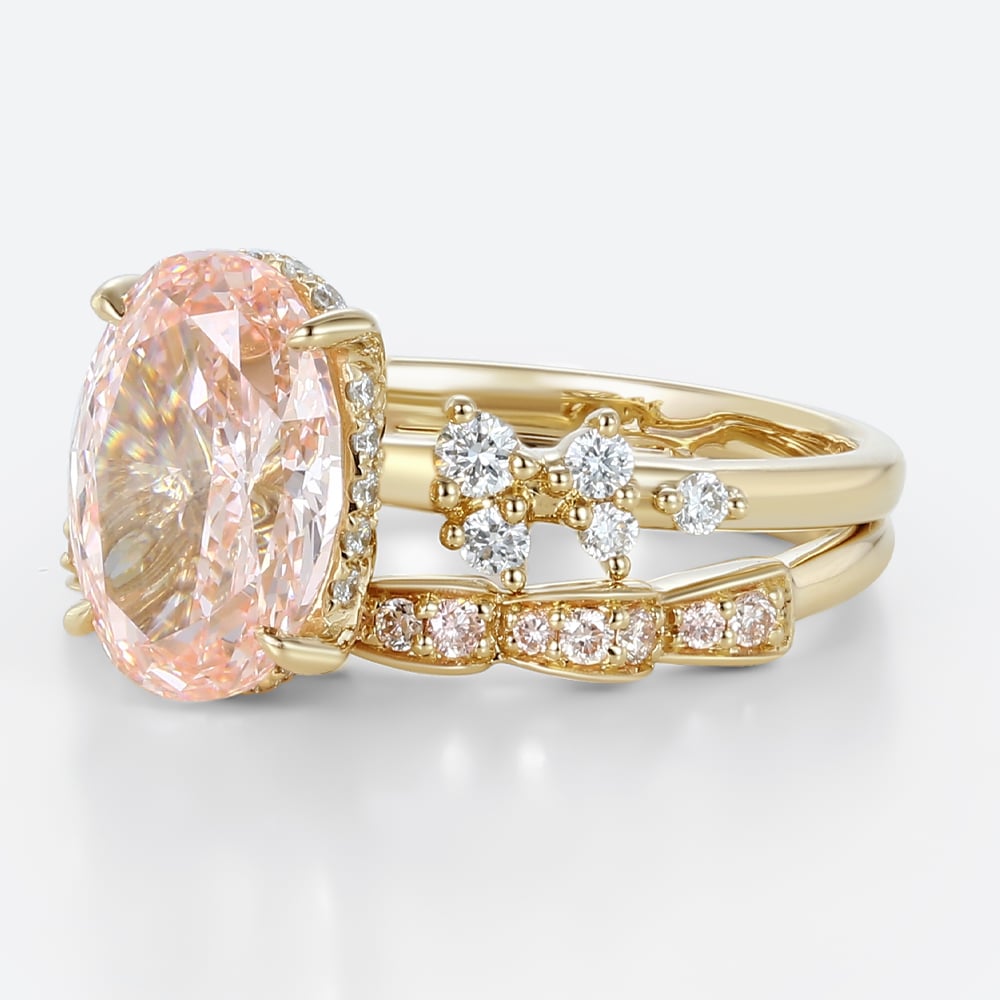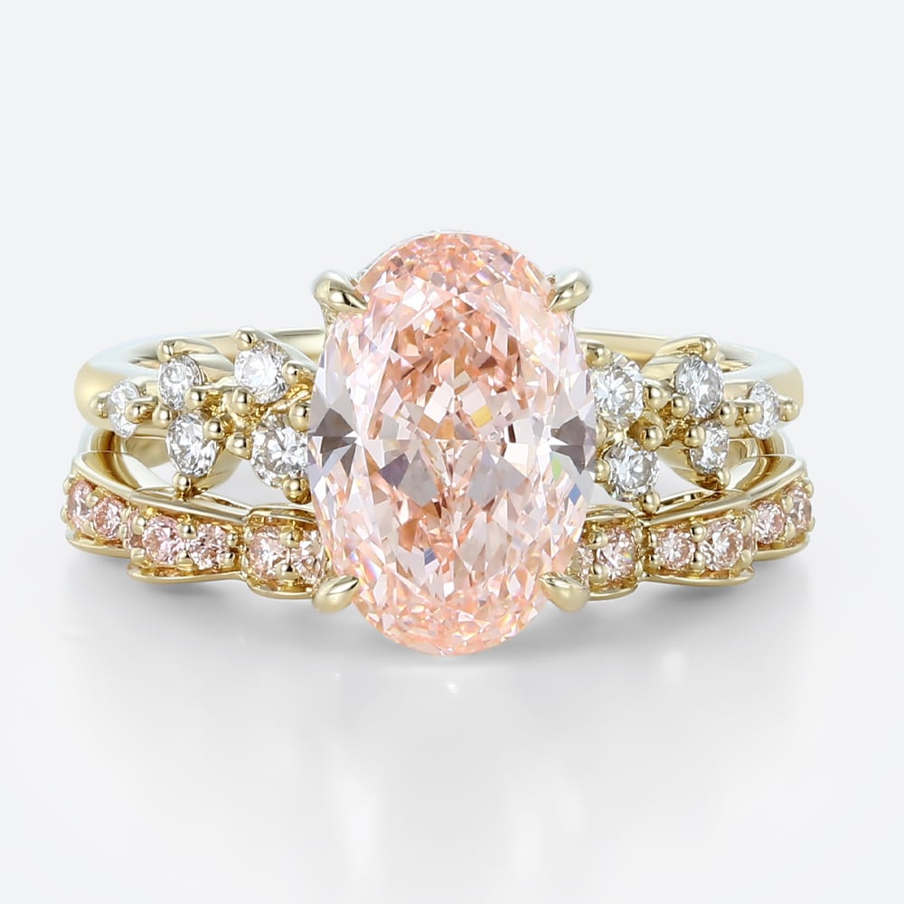 3ct Fancy Pink VS+ Oval Cut Lab Grown Pink Diamond Art Nouveau 4 Claw Prong Bridal Ring Set in Yellow Gold