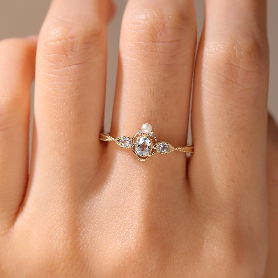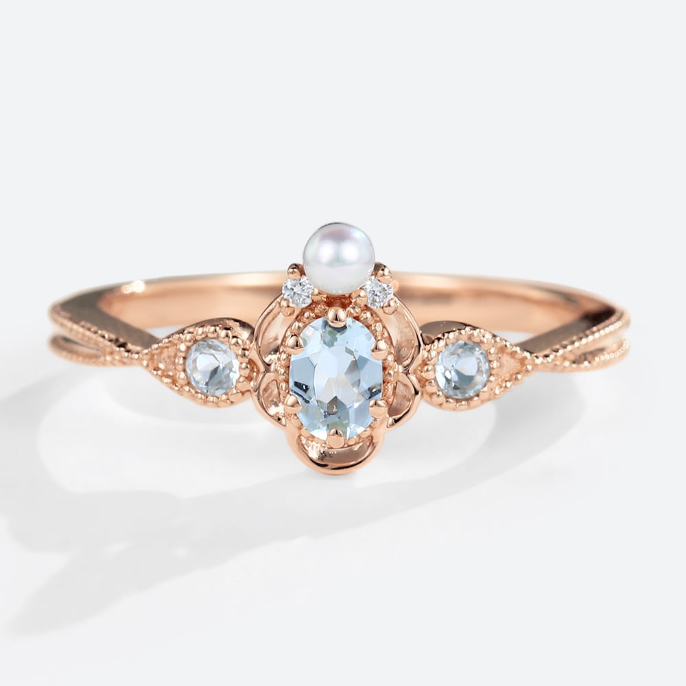 Yellow Gold Unique Aquamarine and Pearl Vintage Engagement Ring Promise Ring