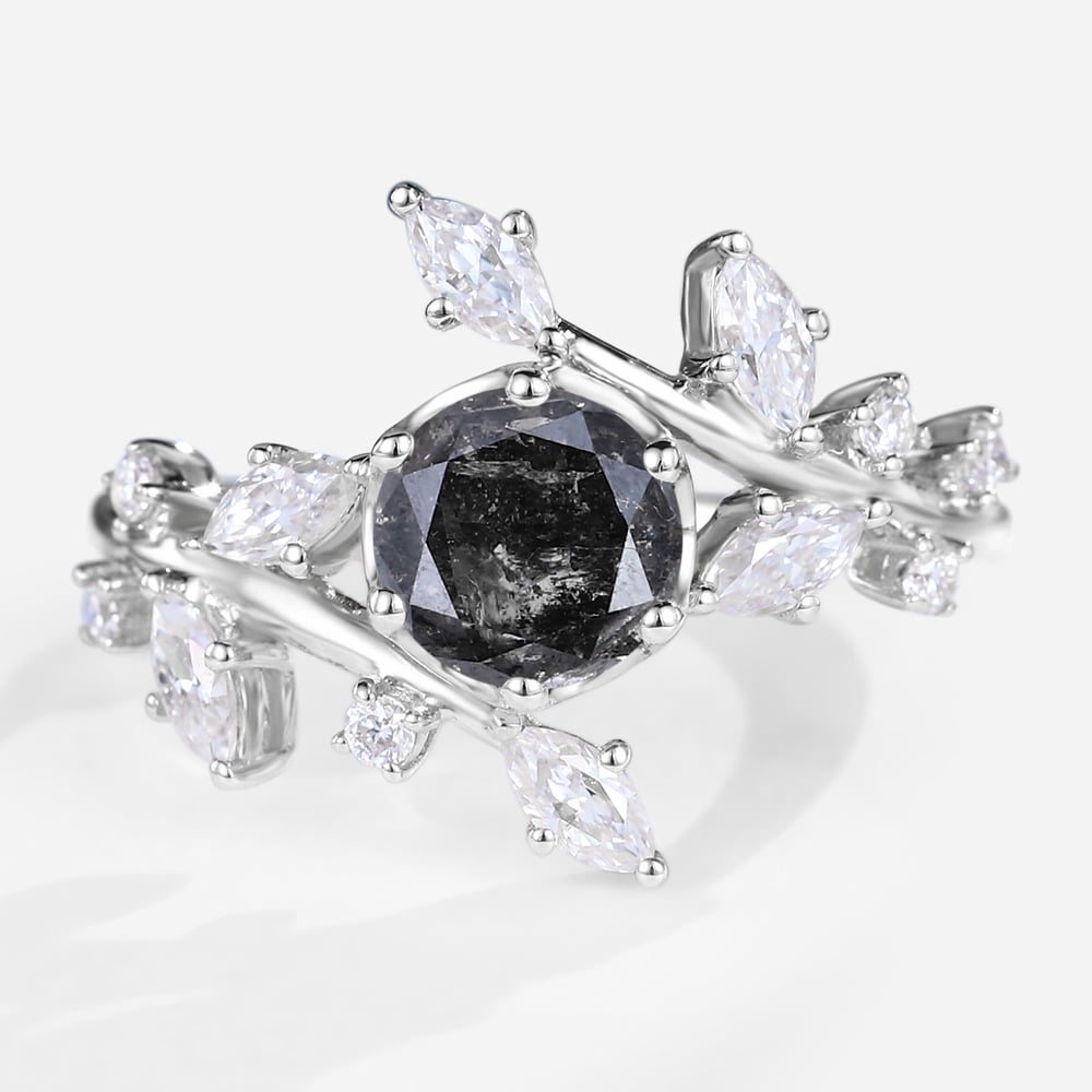 Round Cut Salt & Pepper Diamond Engagement Ring Leaf Bridal Ring