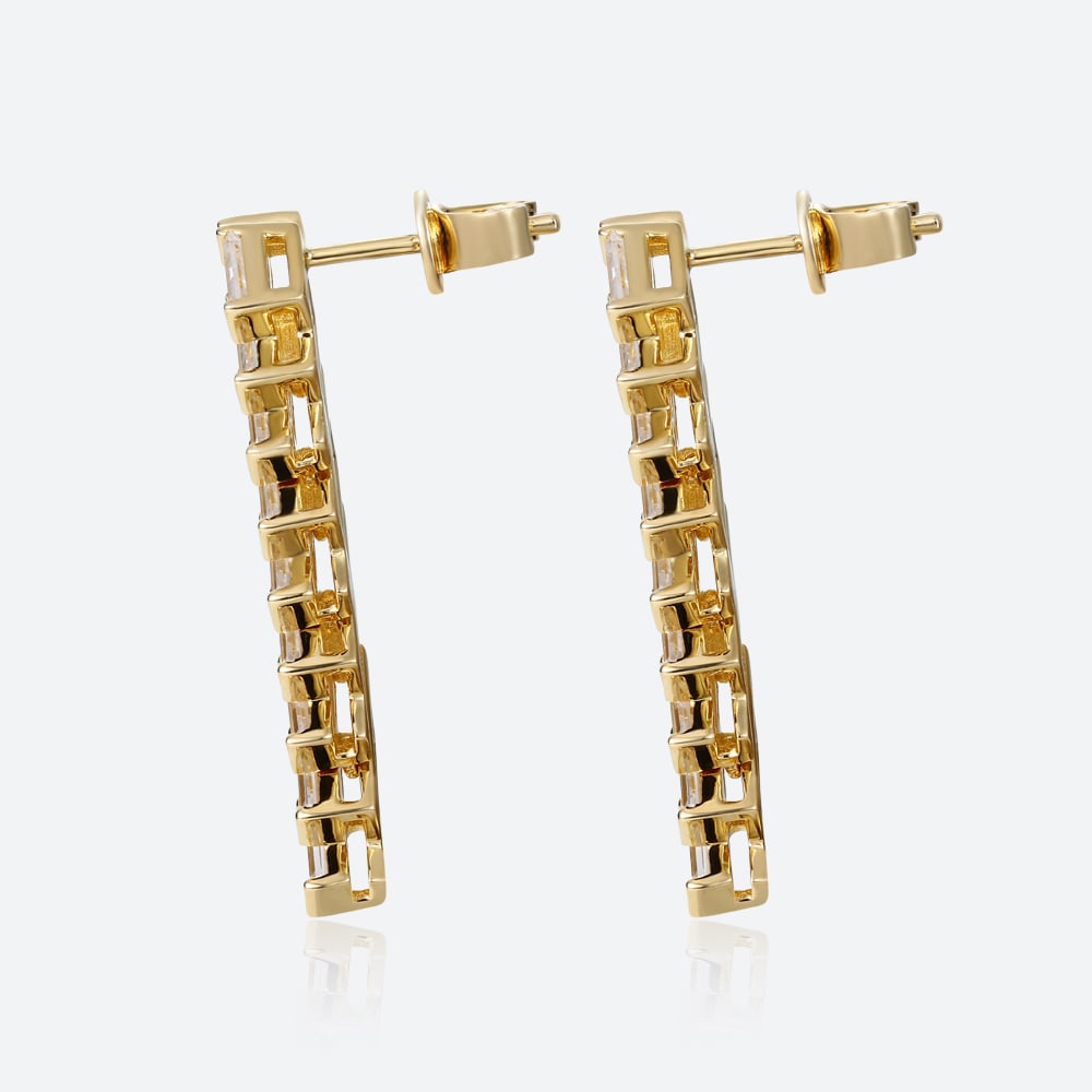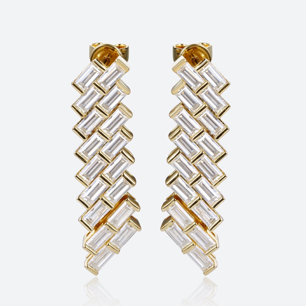 Baguette Cut Lab Grown Diamond Modern Geometric Stud Drop Earrings in Yellow Gold