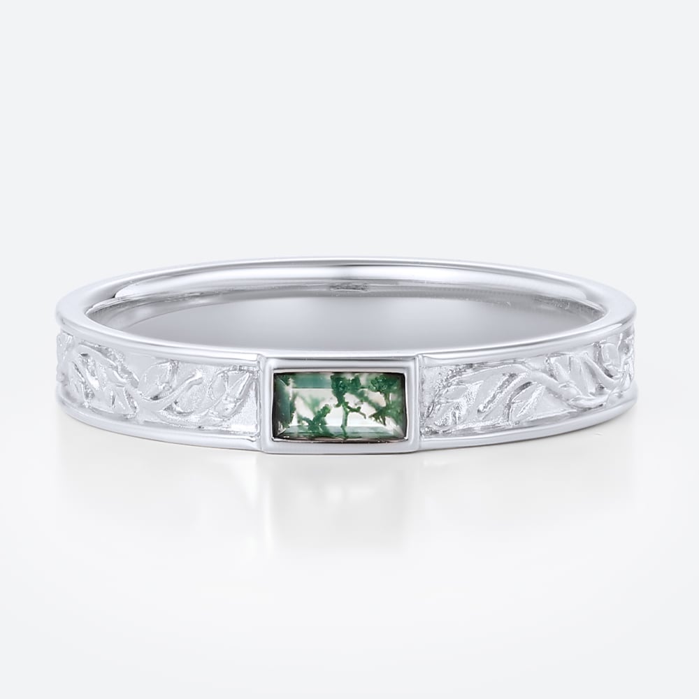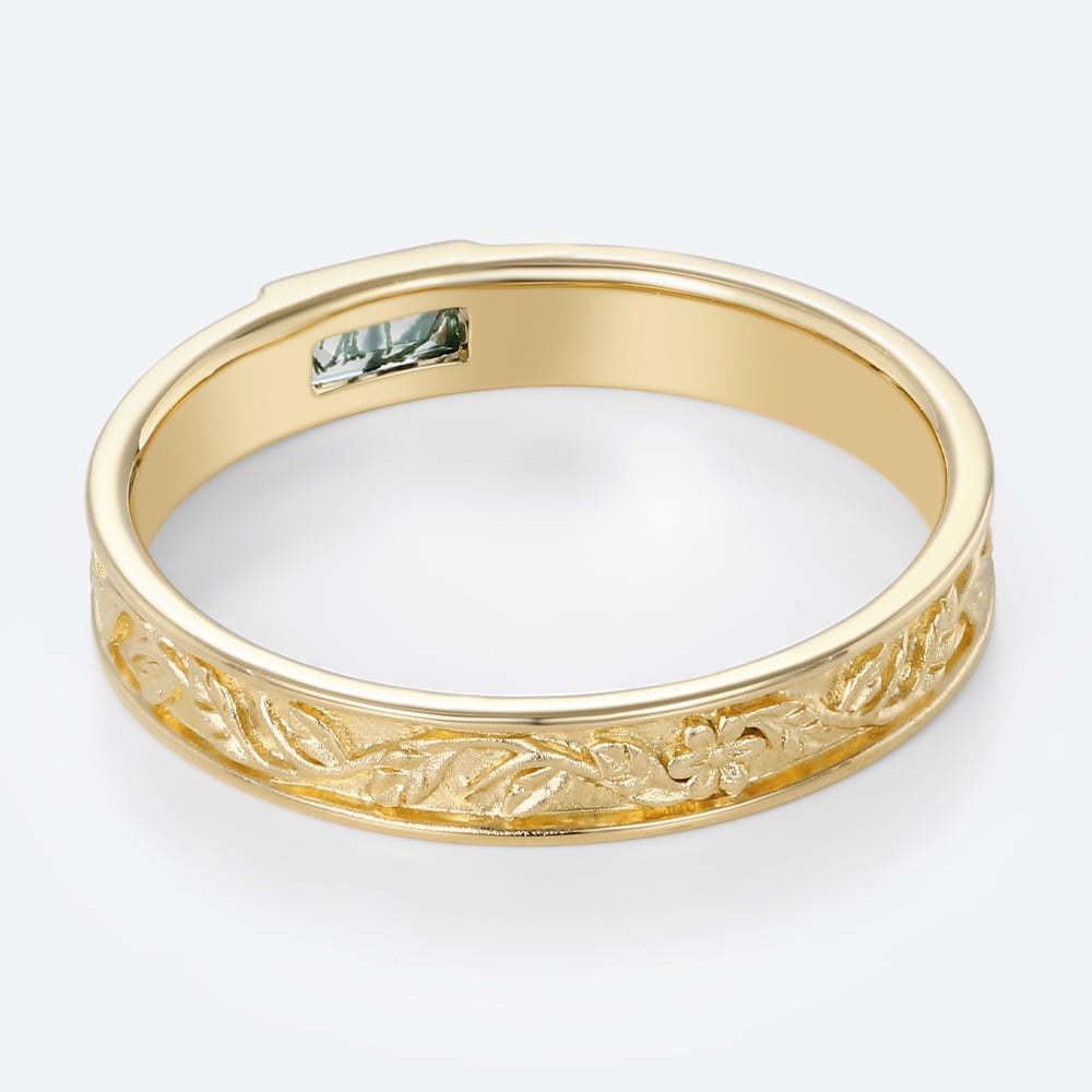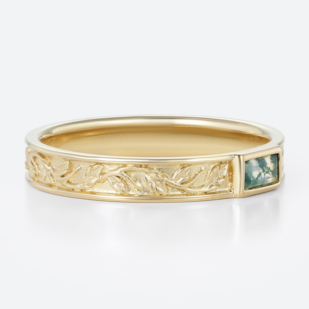 Baguette Cut Moss Agate Bezel-Set Leaf Engraved Wide Band in Yellow Gold