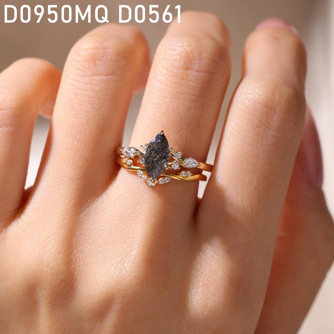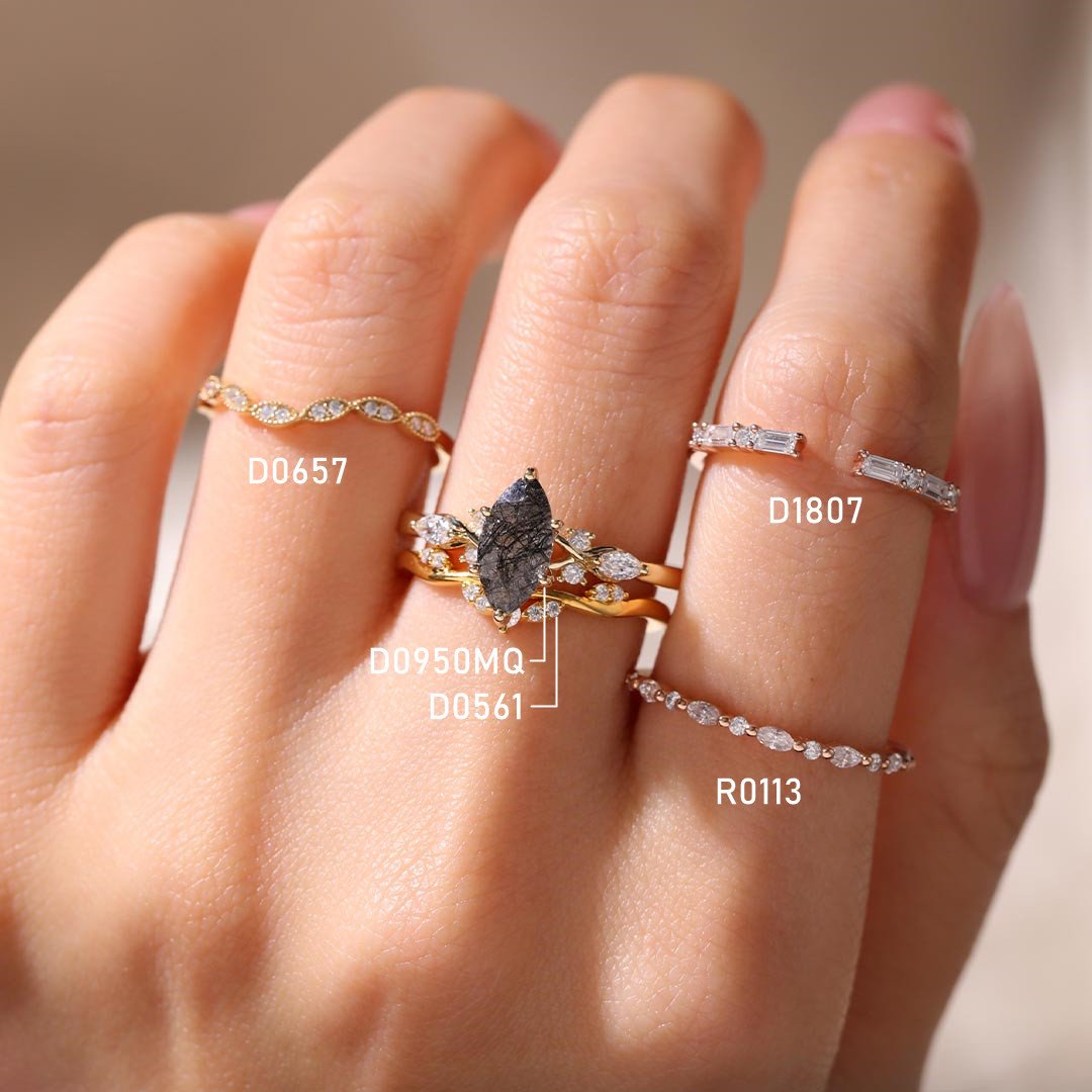 Marquise cut Black Rutilated Quartz engagement ring rose gold Moissanite ring vintage Diamond ring art deco unique promise ring anniversary gift
