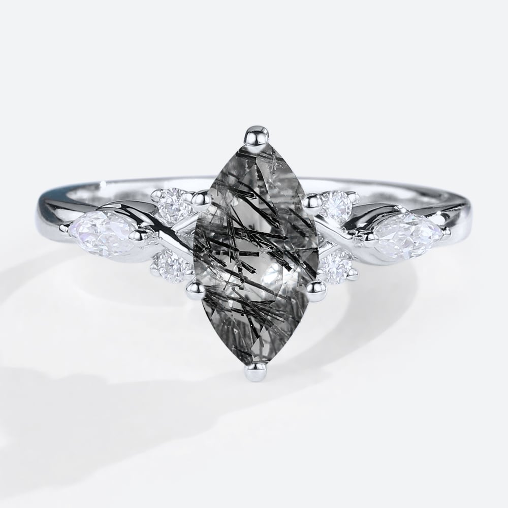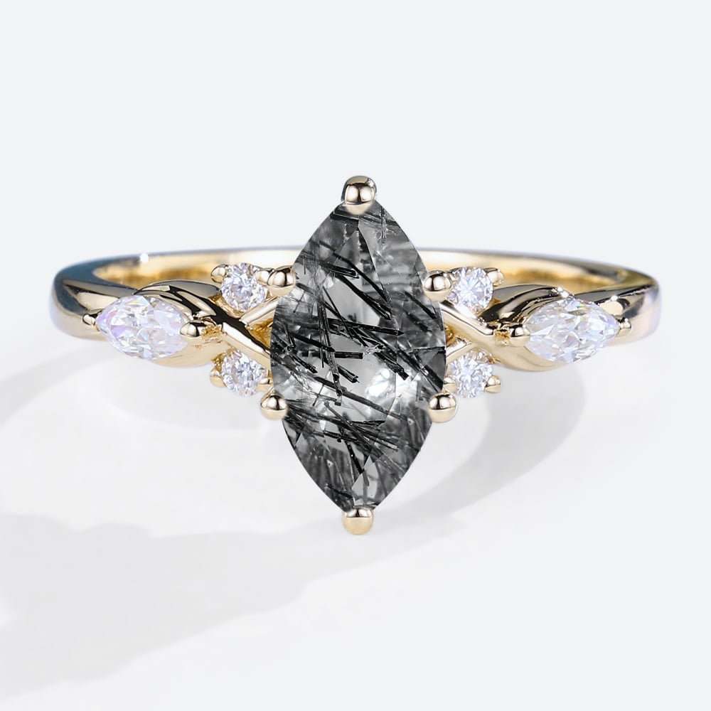 Rose Gold Marquise Cut Black Rutilated Quartz Ring Marquise Cut Diamond Side Stone Engagement Ring