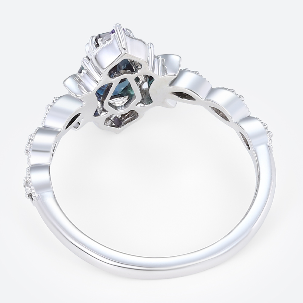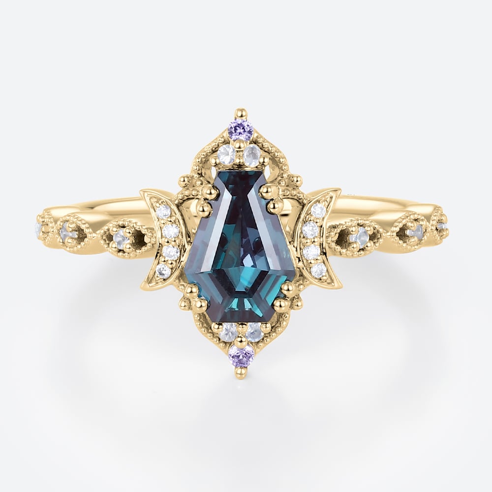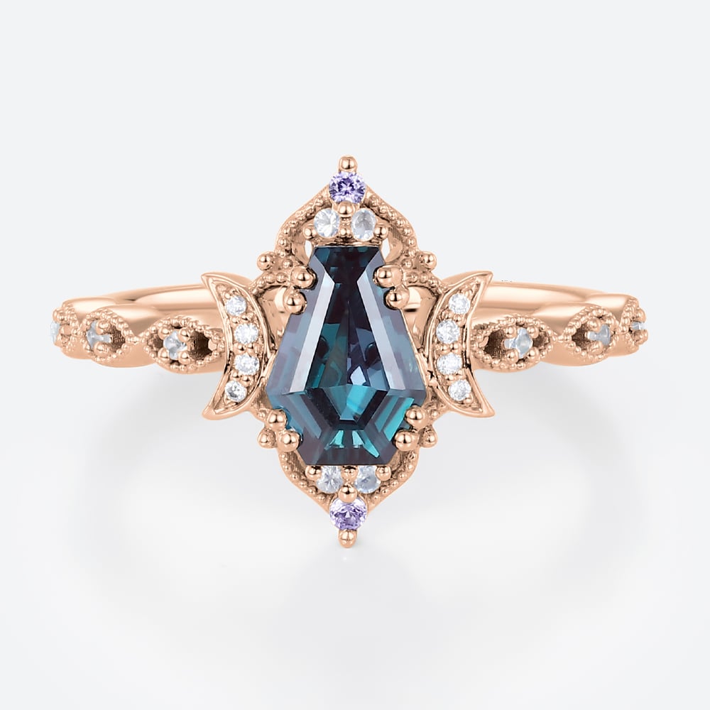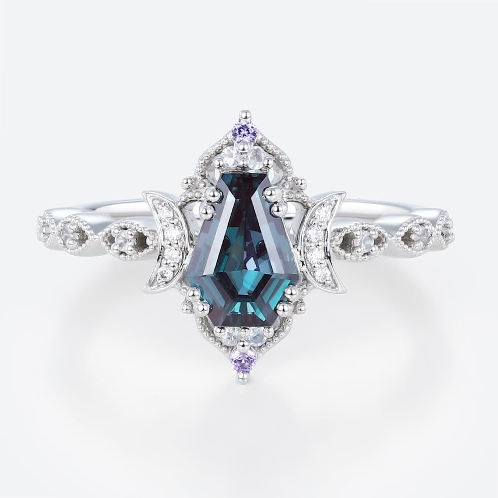 Coffin Shaped Lab Alexandrite Crescent Moon Gothic Engagement Ring in White Gold