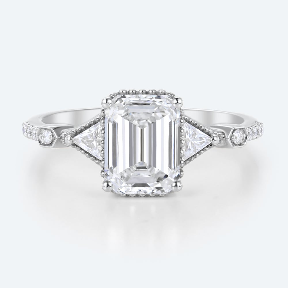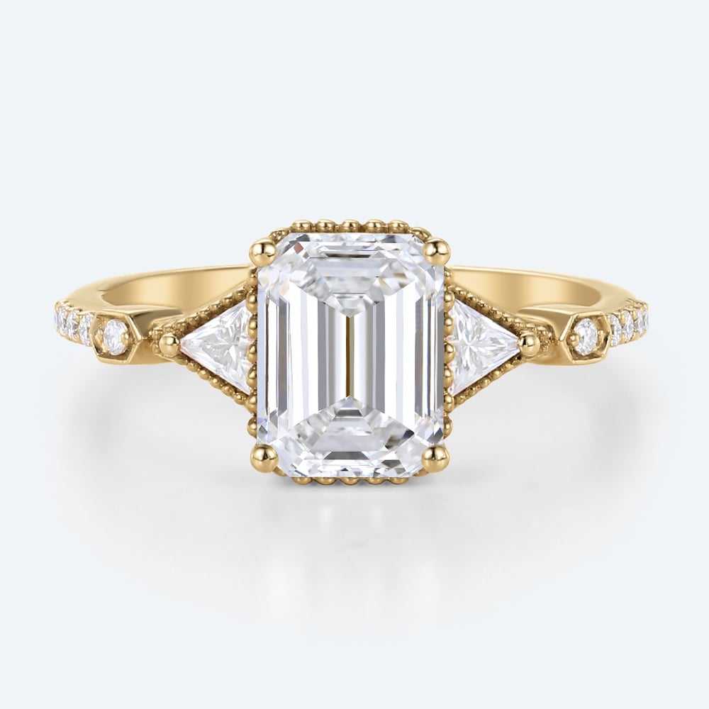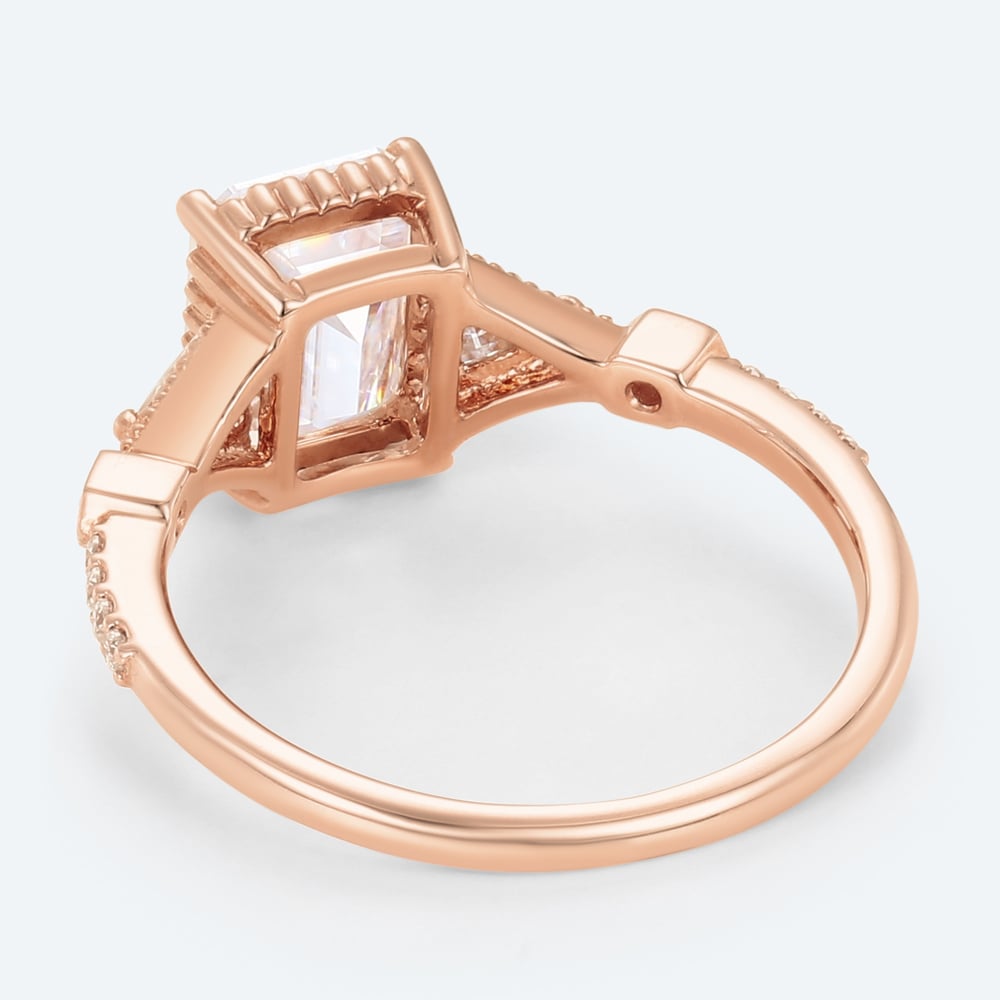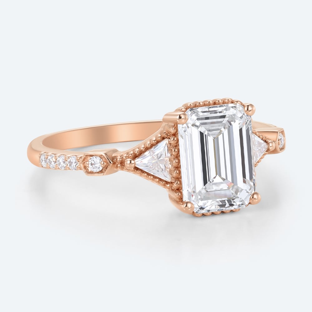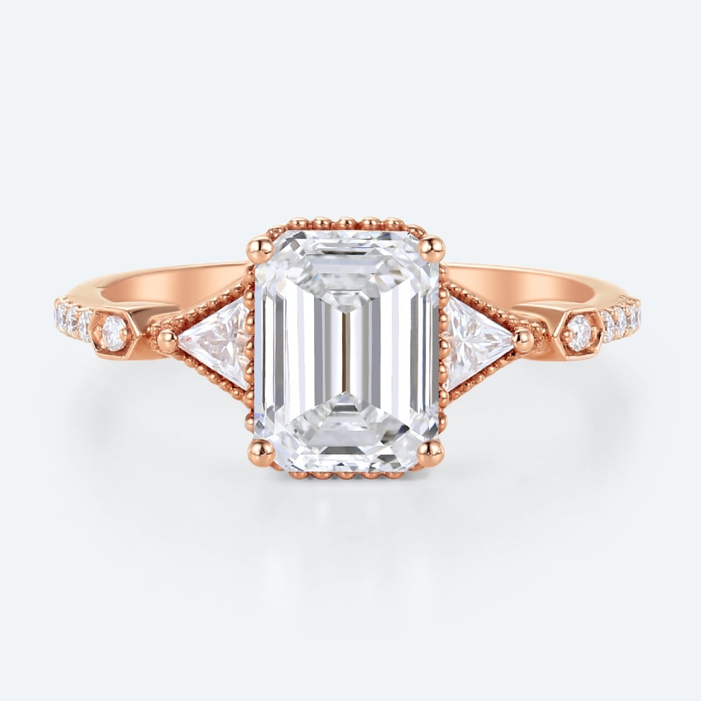 Emerald Cut Lab Grown Diamond Vintage Three Stone Beaded 4-Prong Engagement Ring in Rose Gold