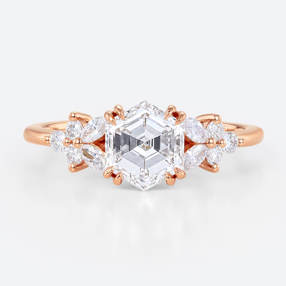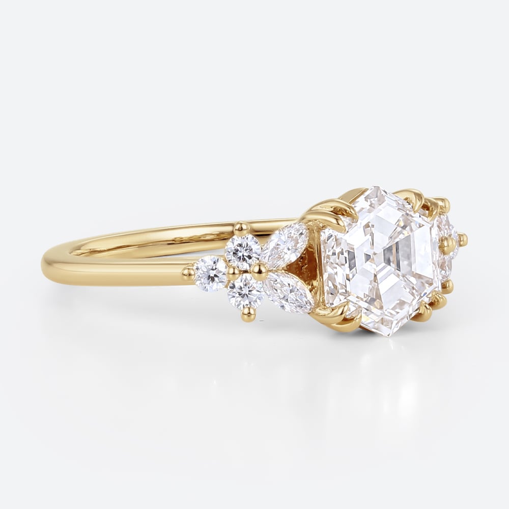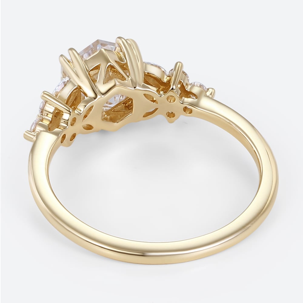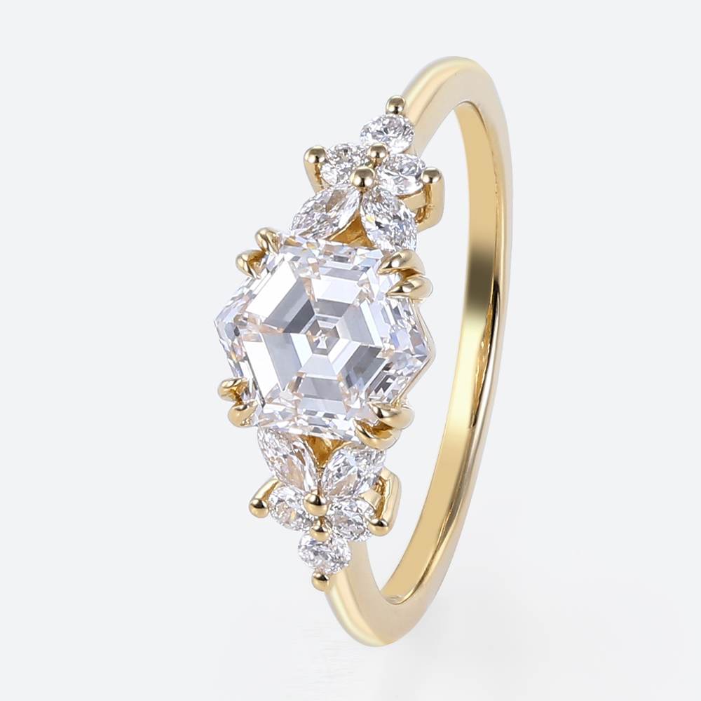 1ct Colorless VS+ Hexagon Cut Lab Grown Diamond Modern Cluster 4 Double Claw Engagement Ring in Yellow Gold