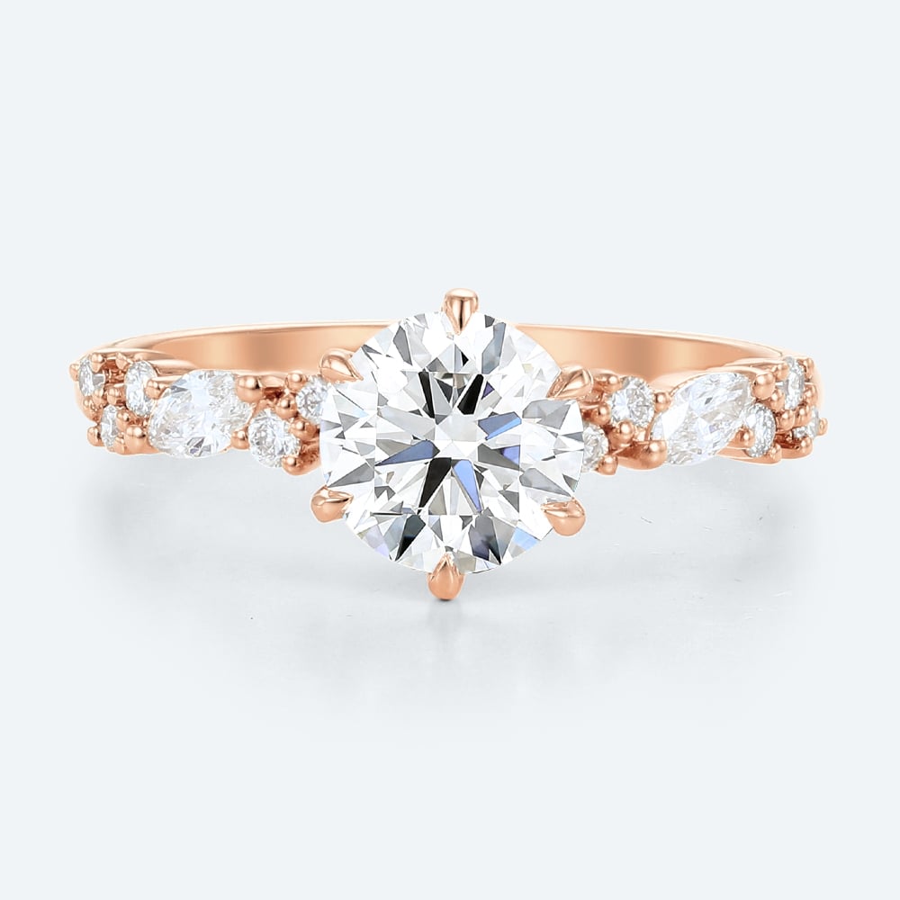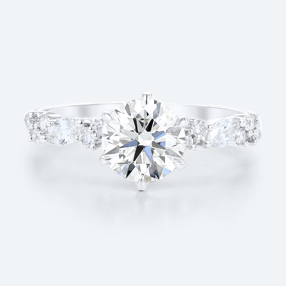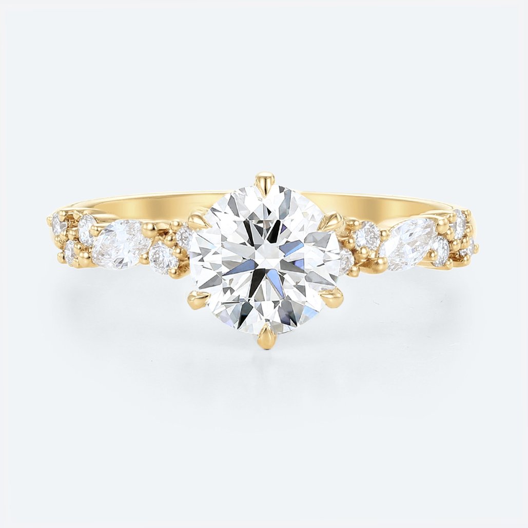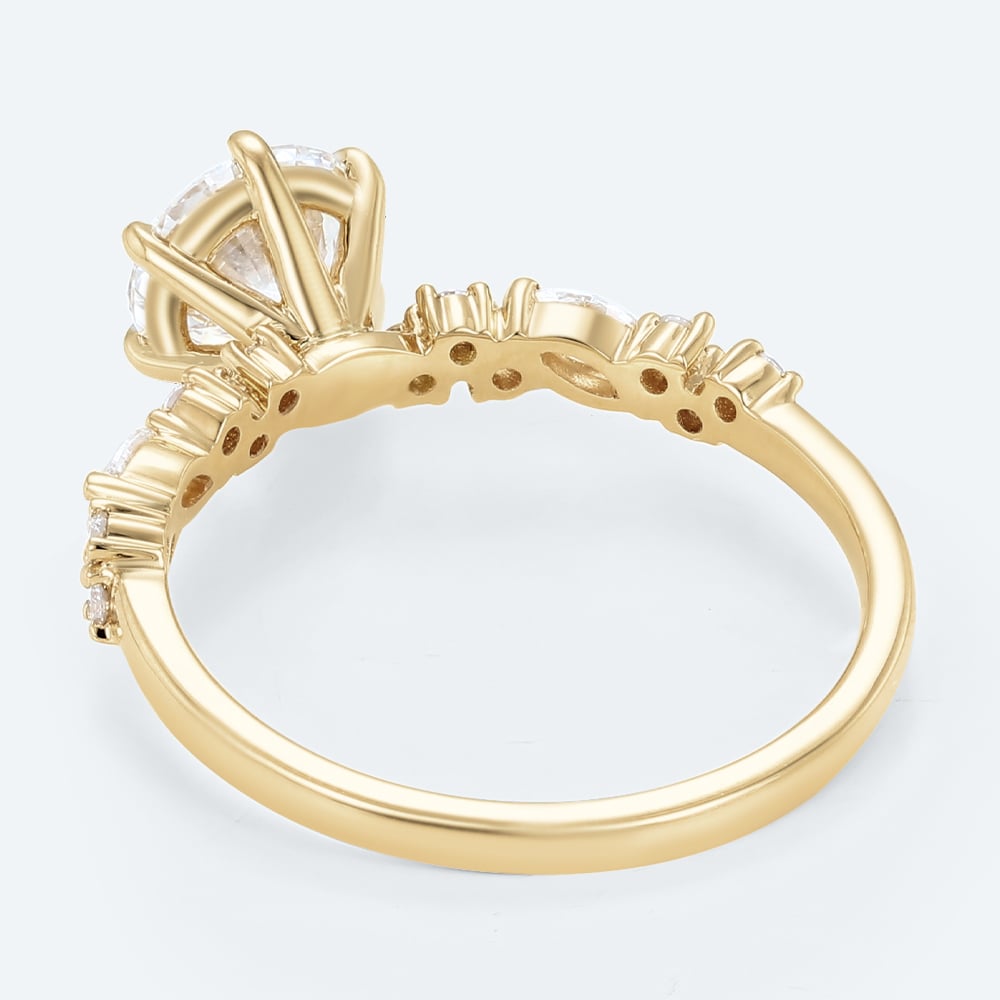 1ct Colorless VS+ Round Cut Lab Grown Diamond Alternating Side Stones 6 Claw Prong Engagement Ring in Yellow Gold