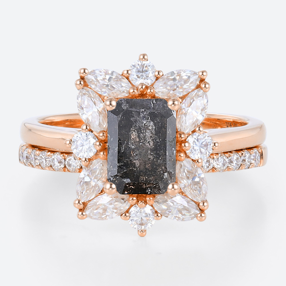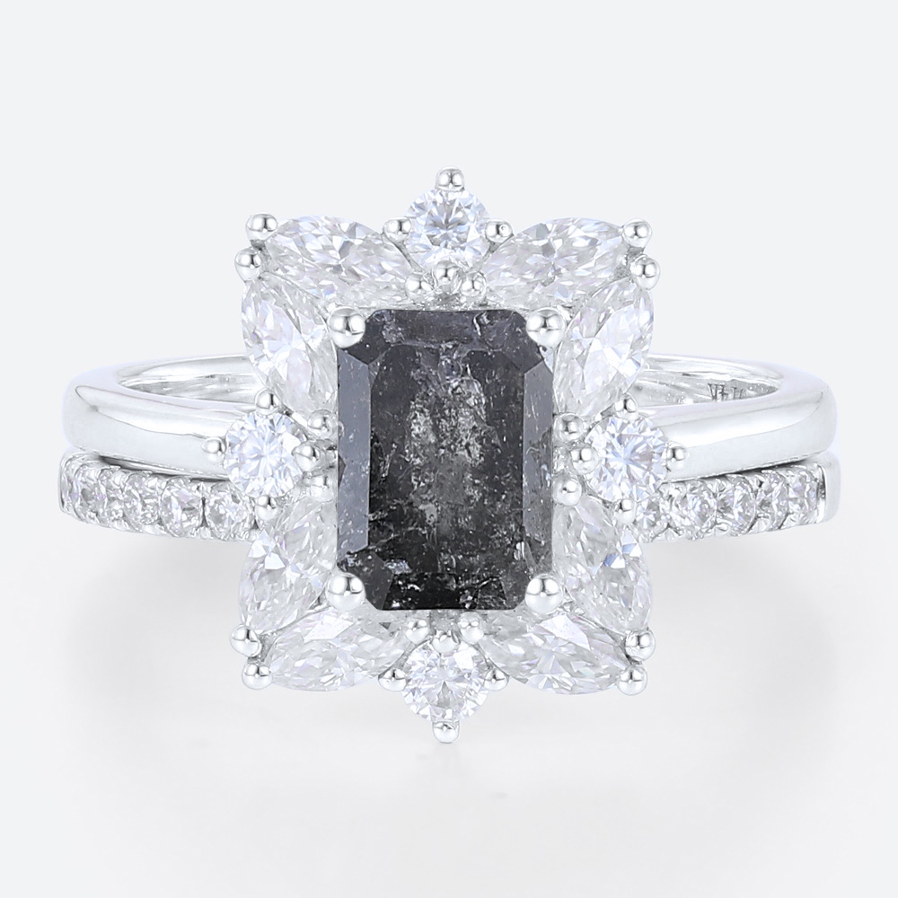 Emerald Cut Salt & Pepper Diamond Halo Bridal Ring Set With Pave Wedding Band