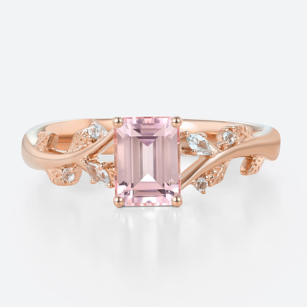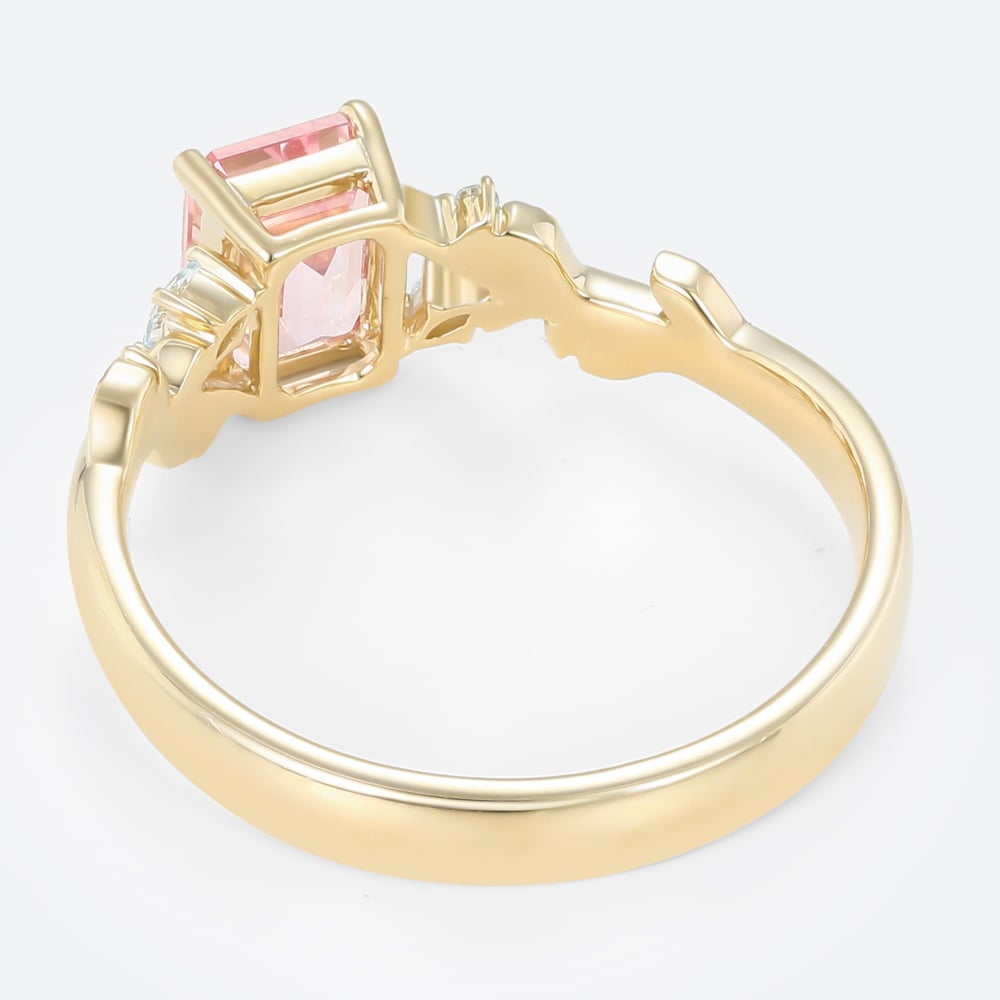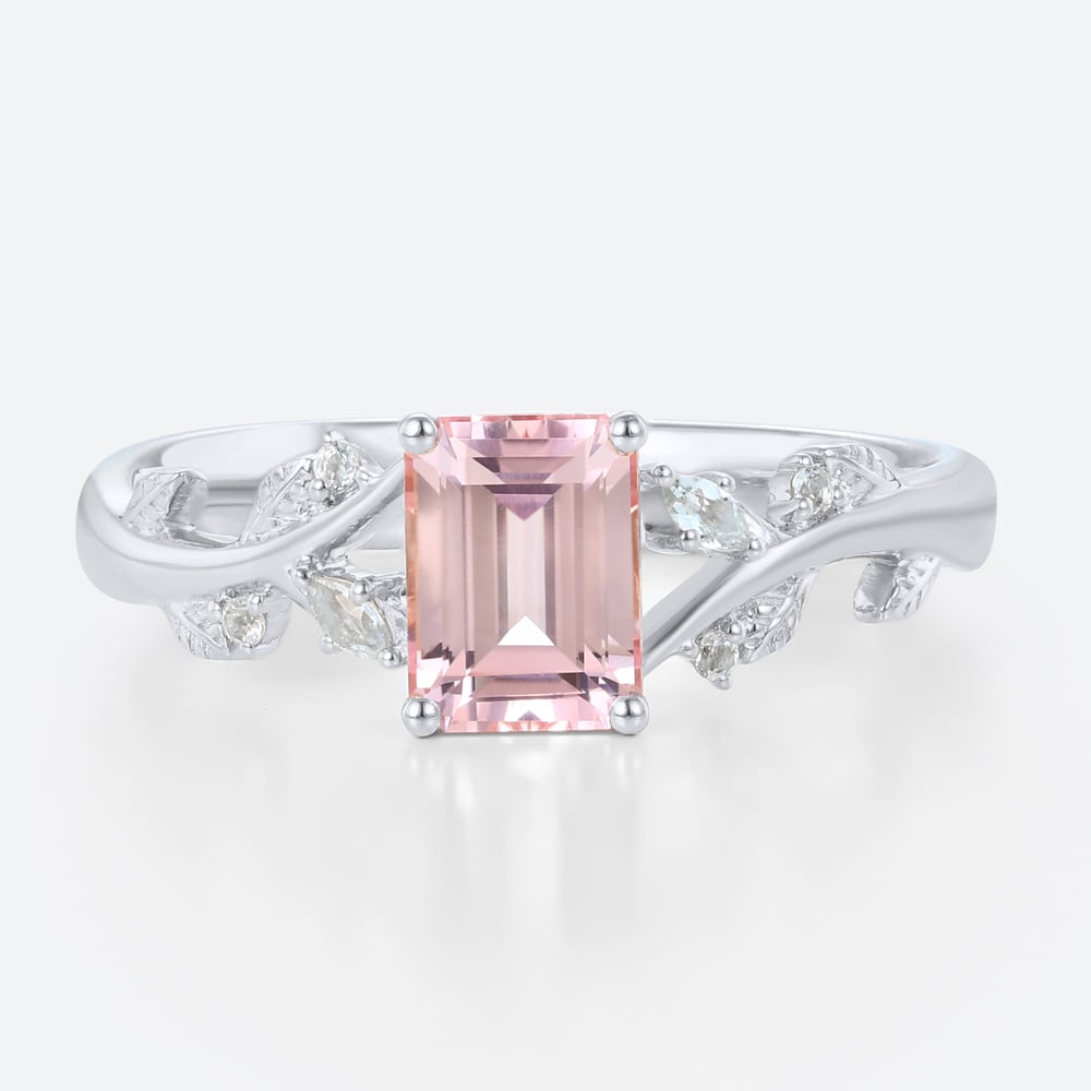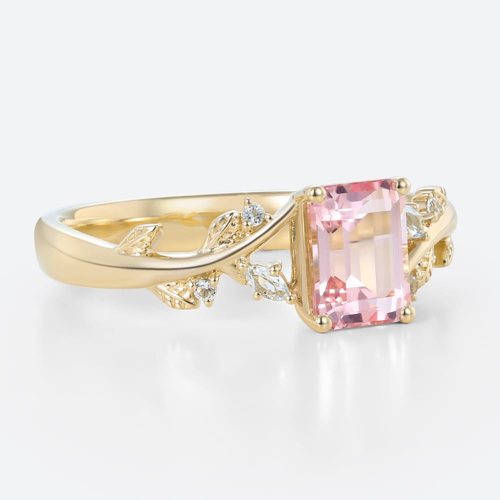 Emerald Cut Morganite Botanical Engagement Ring with Aquamarine Accents in Yellow Gold