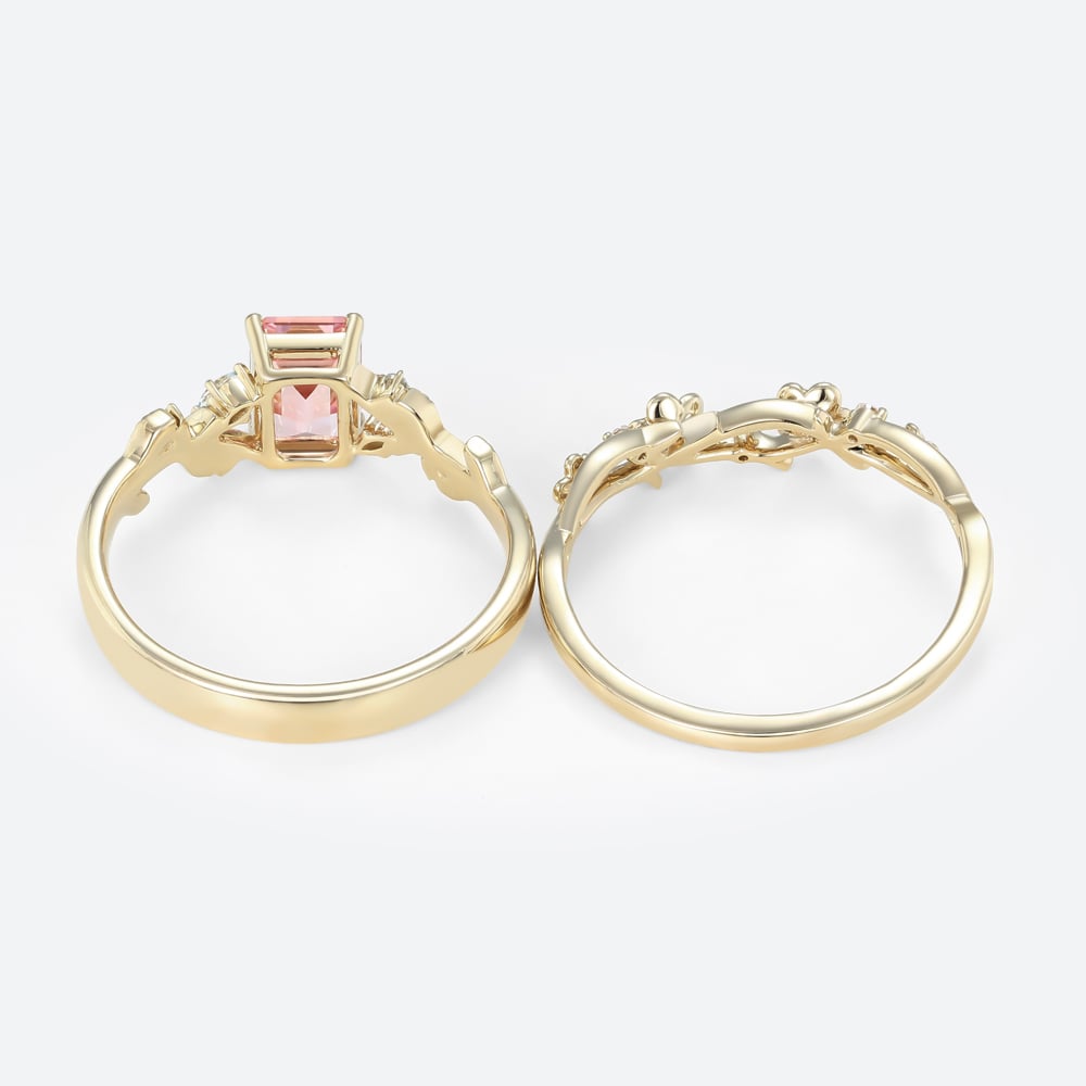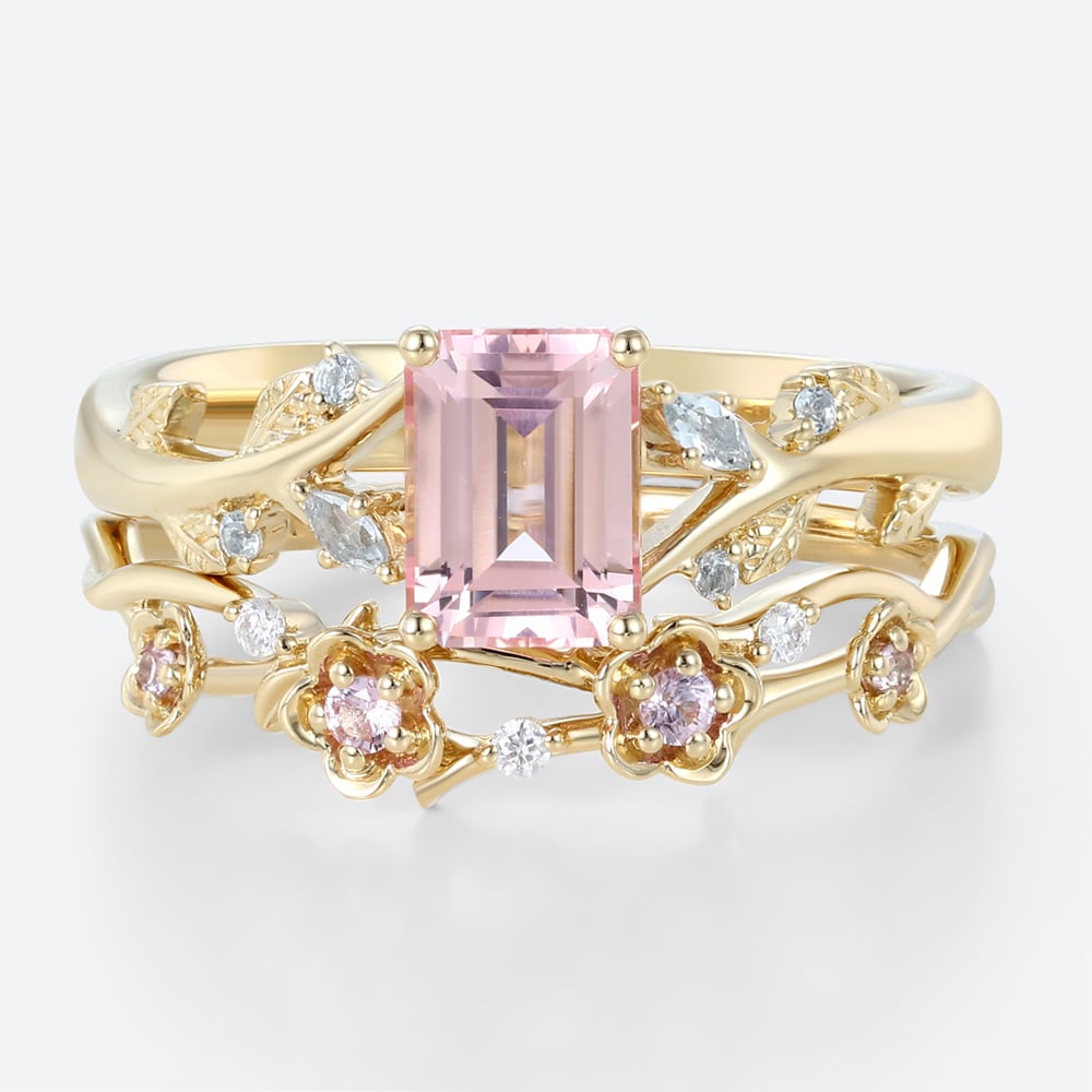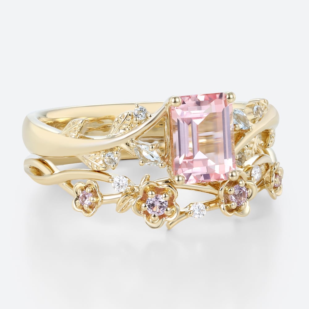 Emerald Cut Morganite Nature-Inspired Bridal Ring Set with Floral Curved Bands in Yellow Gold