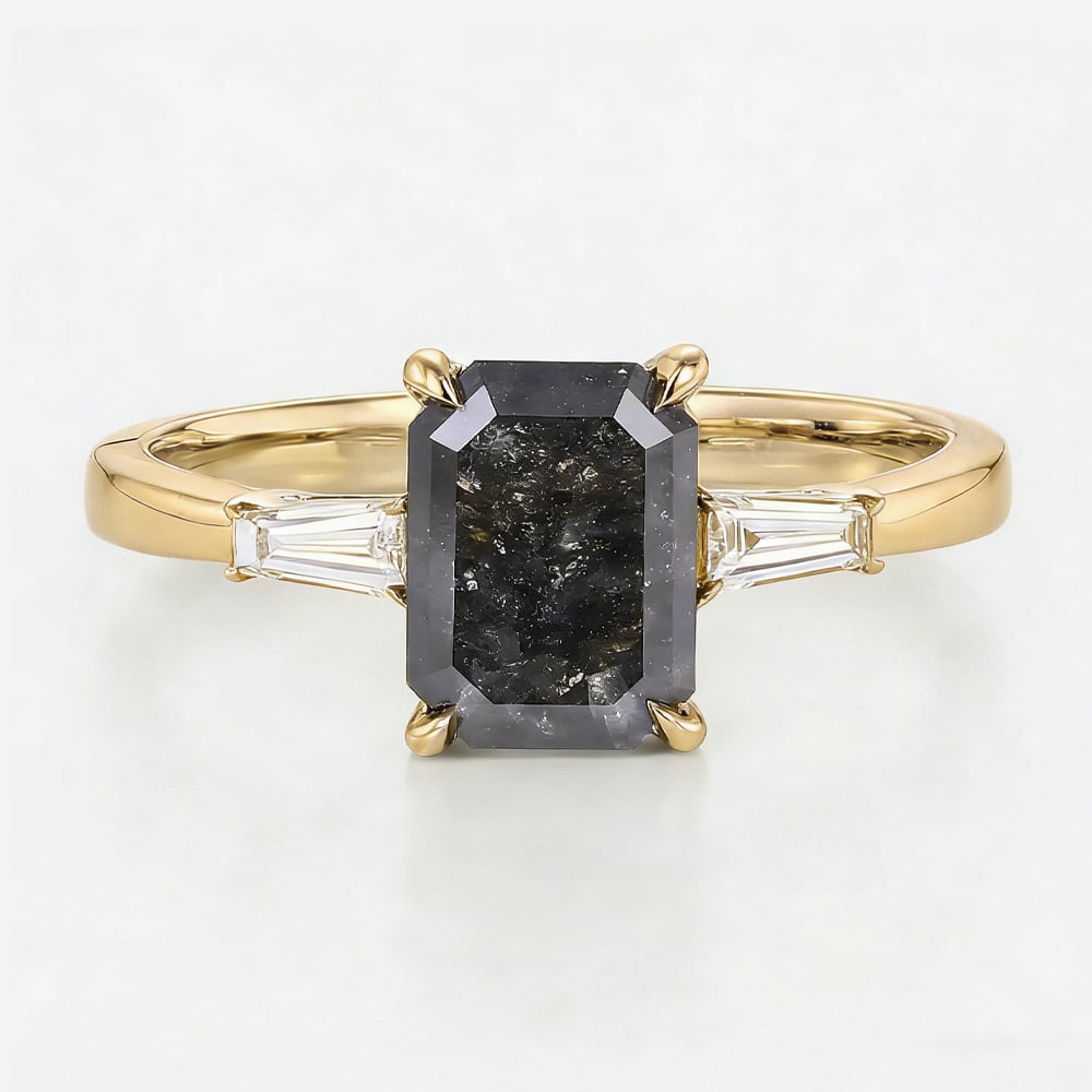 Emerald Cut Salt and Pepper Diamond Engagement Ring Tapered Baguette Accented Bridal Ring