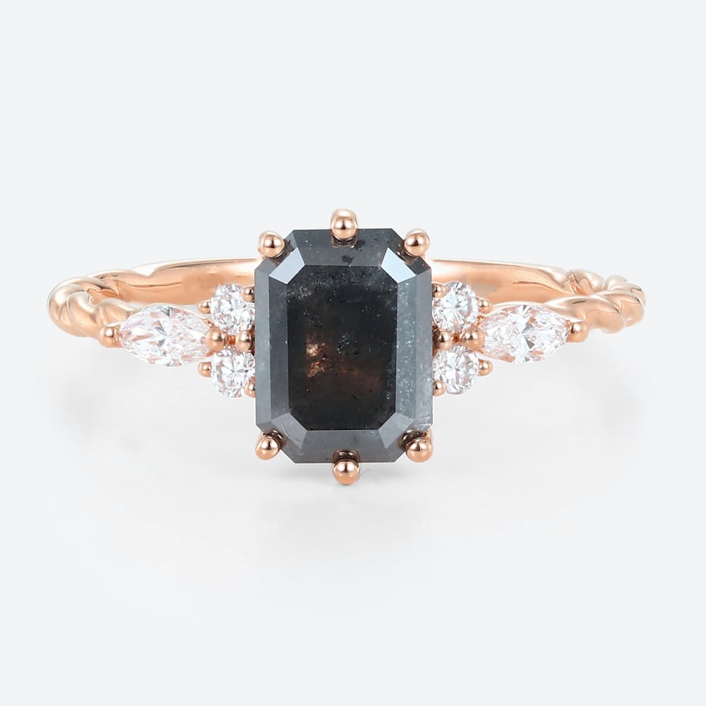 Emerald Cut Salt And Pepper Diamond Engagement Ring Twisted Cluster Bridal Ring