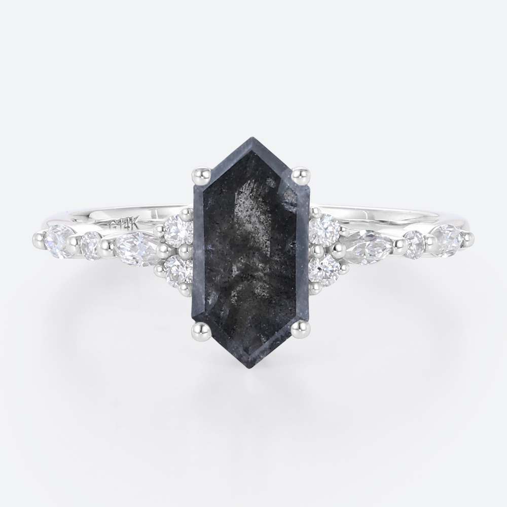 Elongated Hexagon Salt and Pepper Diamond Engagement Ring Vintage Bridal Rings