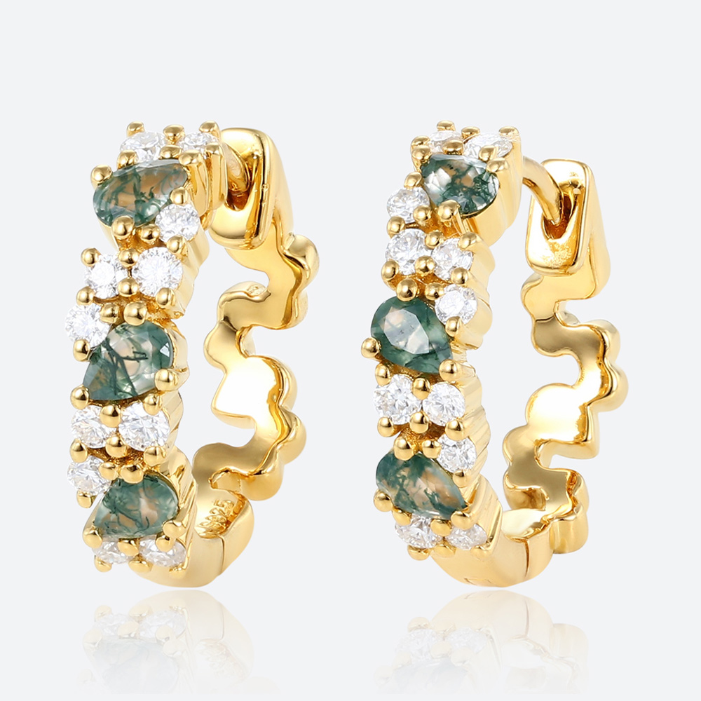Round Cut Lab Diamond Dynamic Style Huggie Earrings with Moss Agate Accents