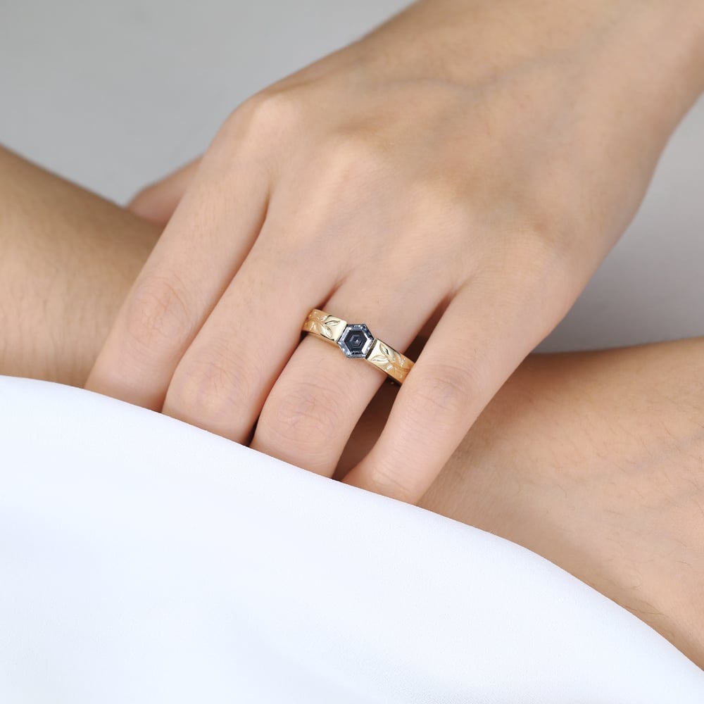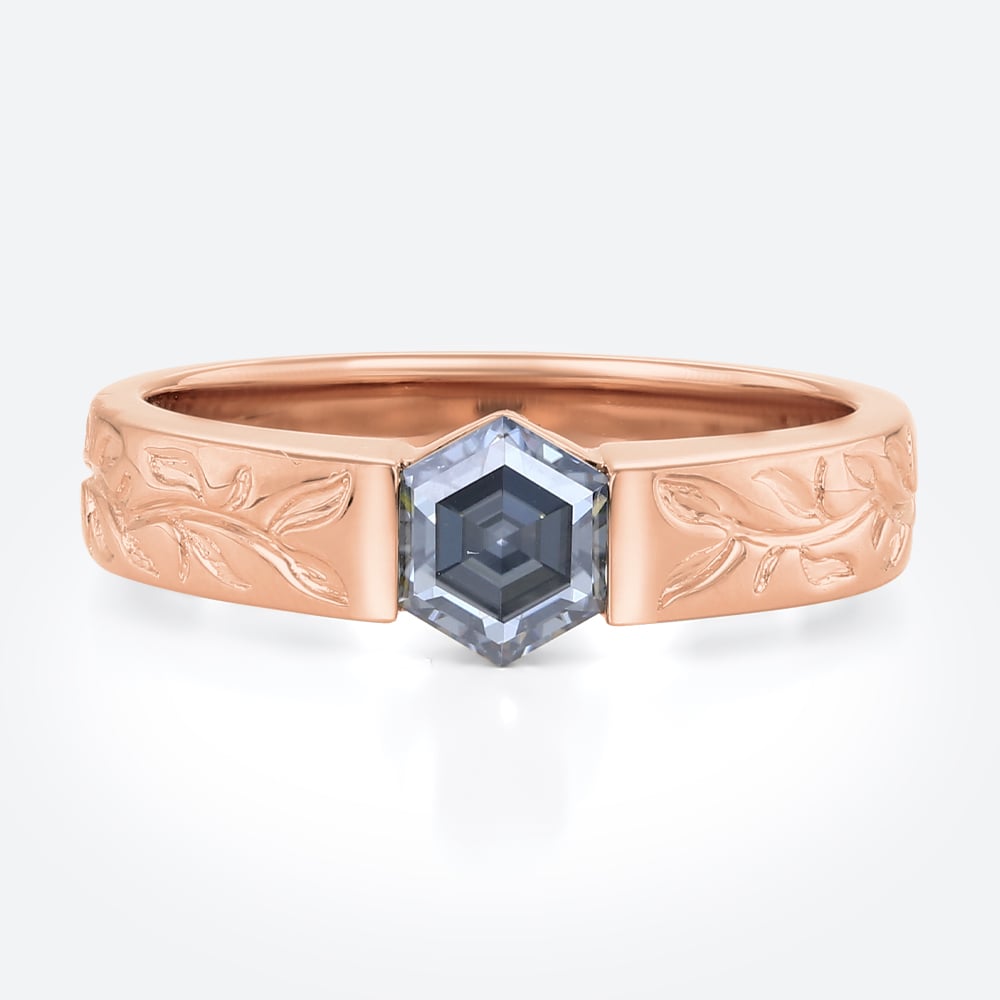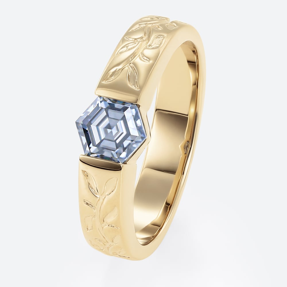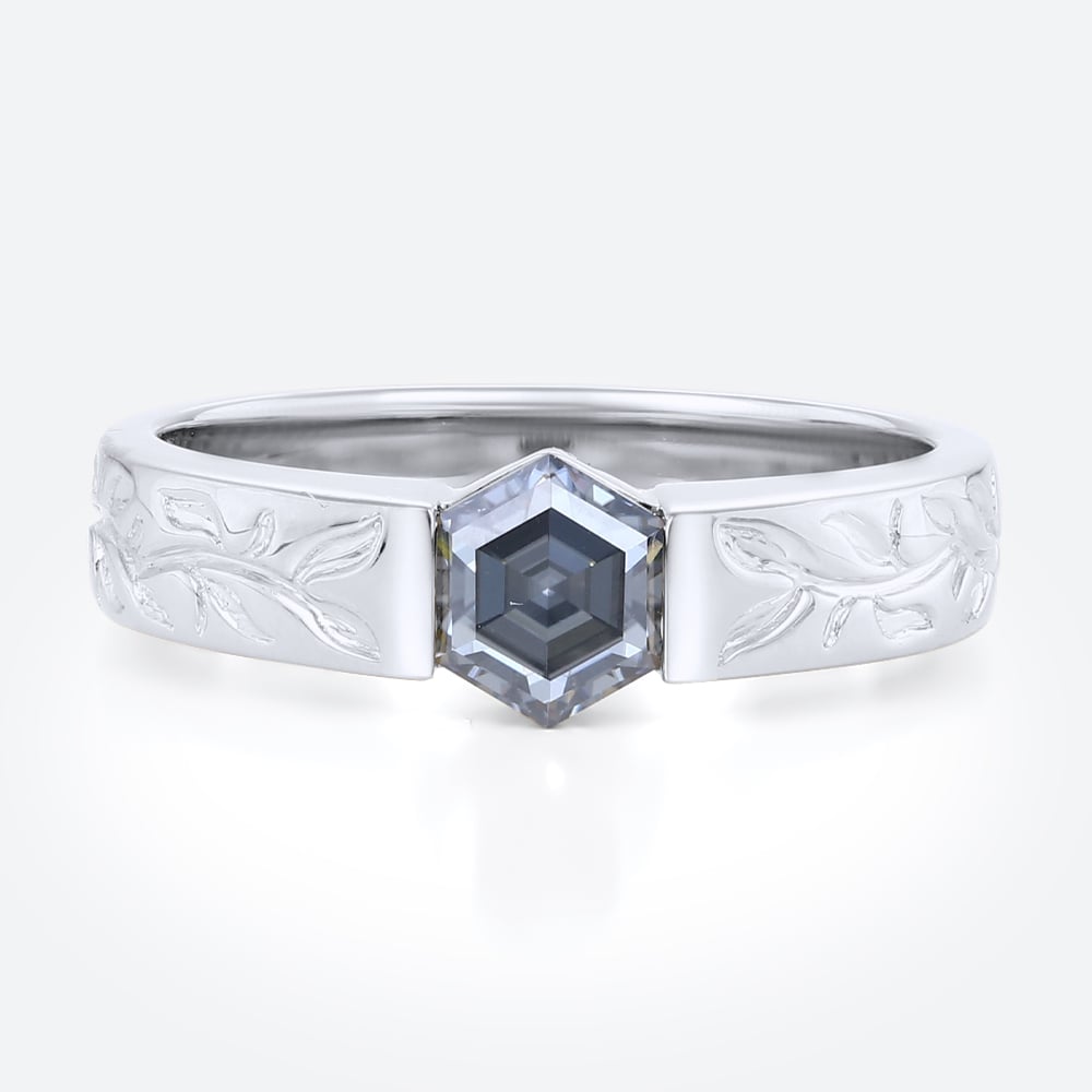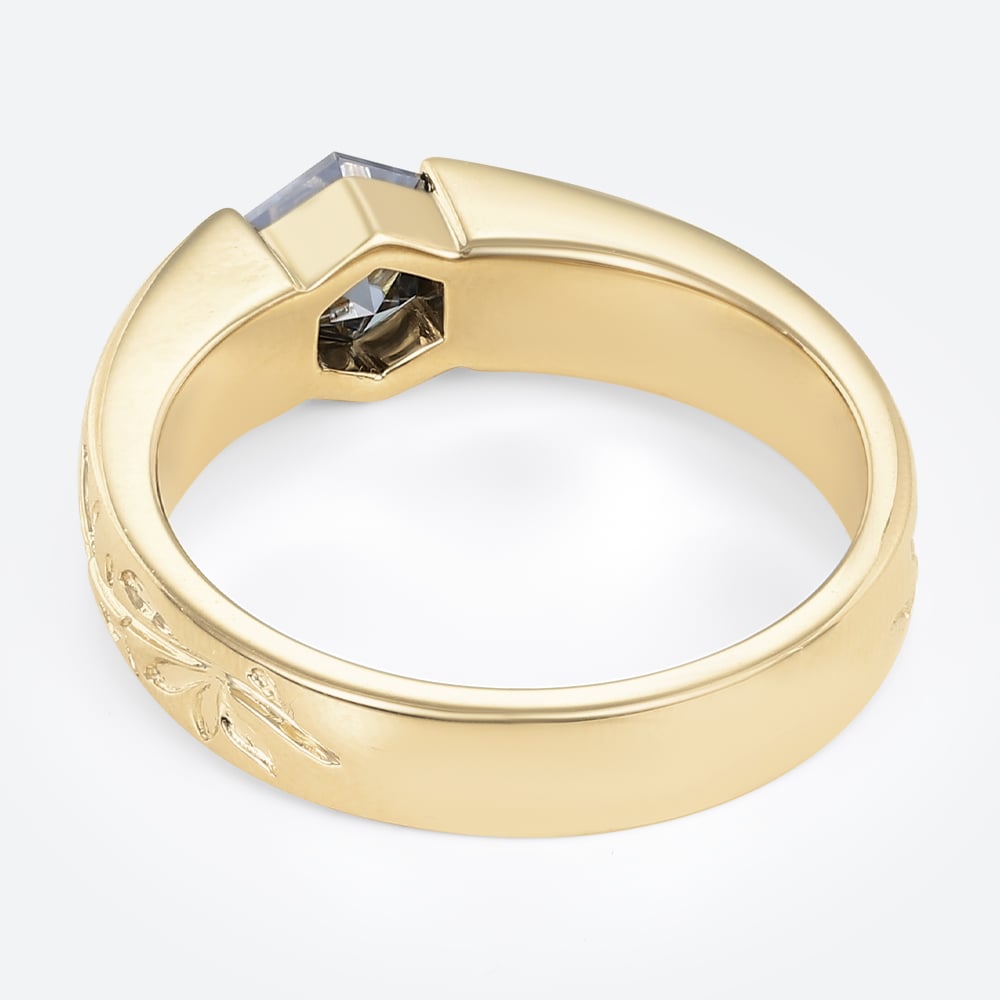 Hexagon Cut Gray Moissanite Leaf Engraved Wide Band in Yellow Gold