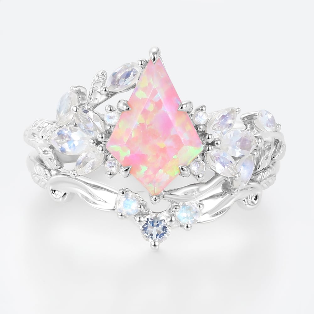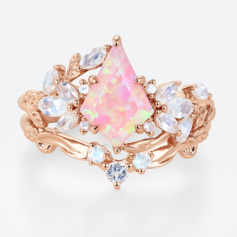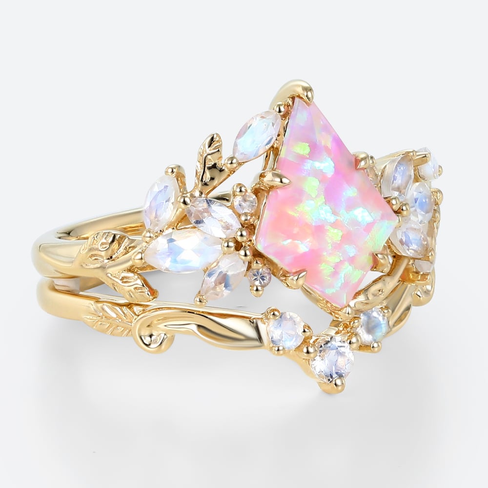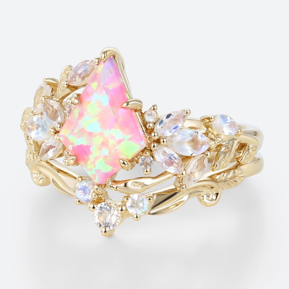 Kite Cut Pink Opal Nature Inspired Engagement Ring with Curved Wedding Band Set in Yellow Gold