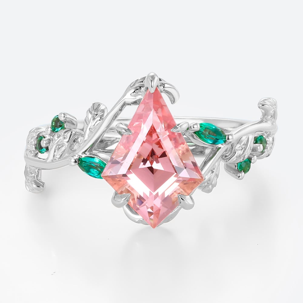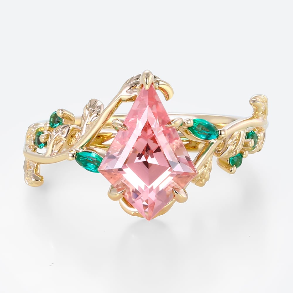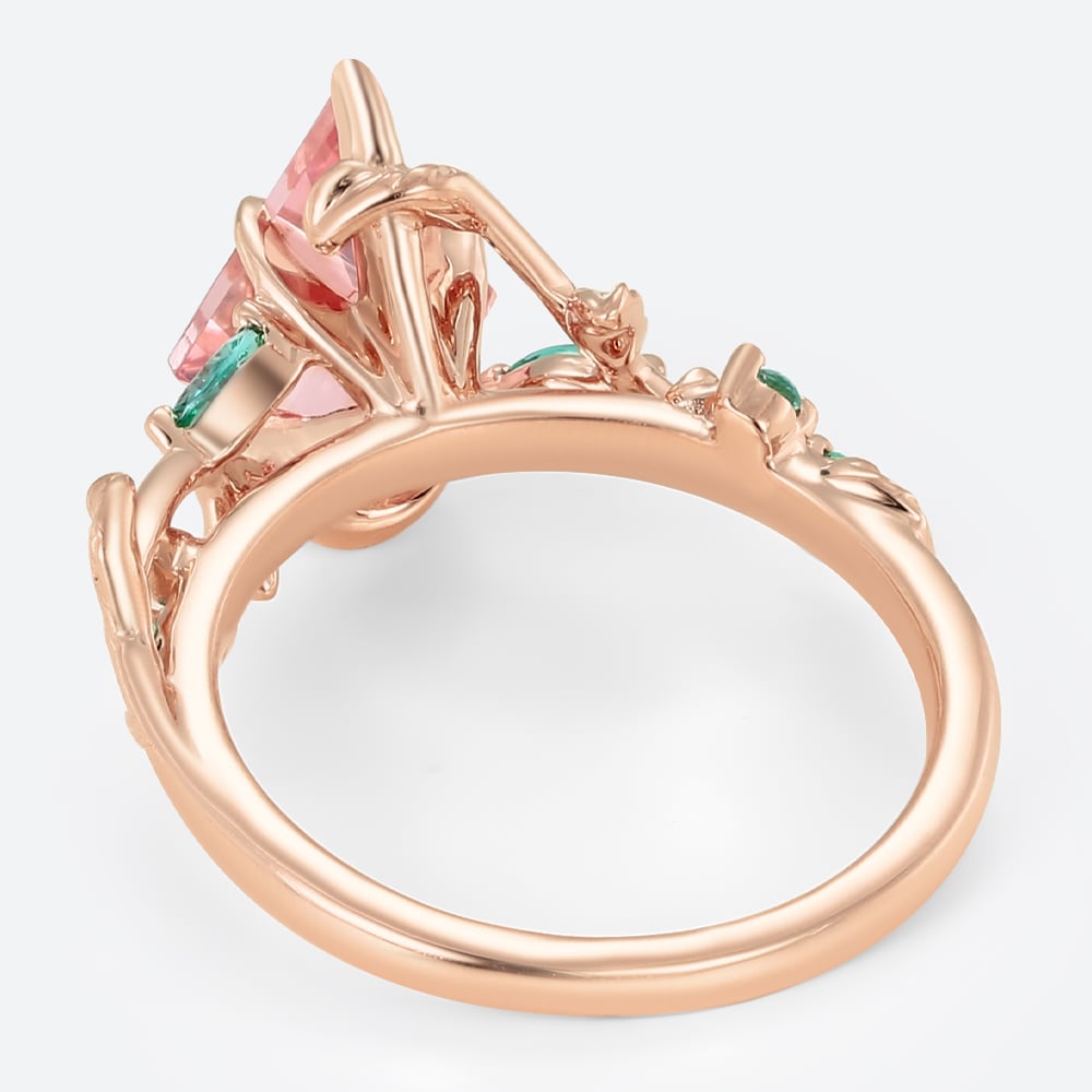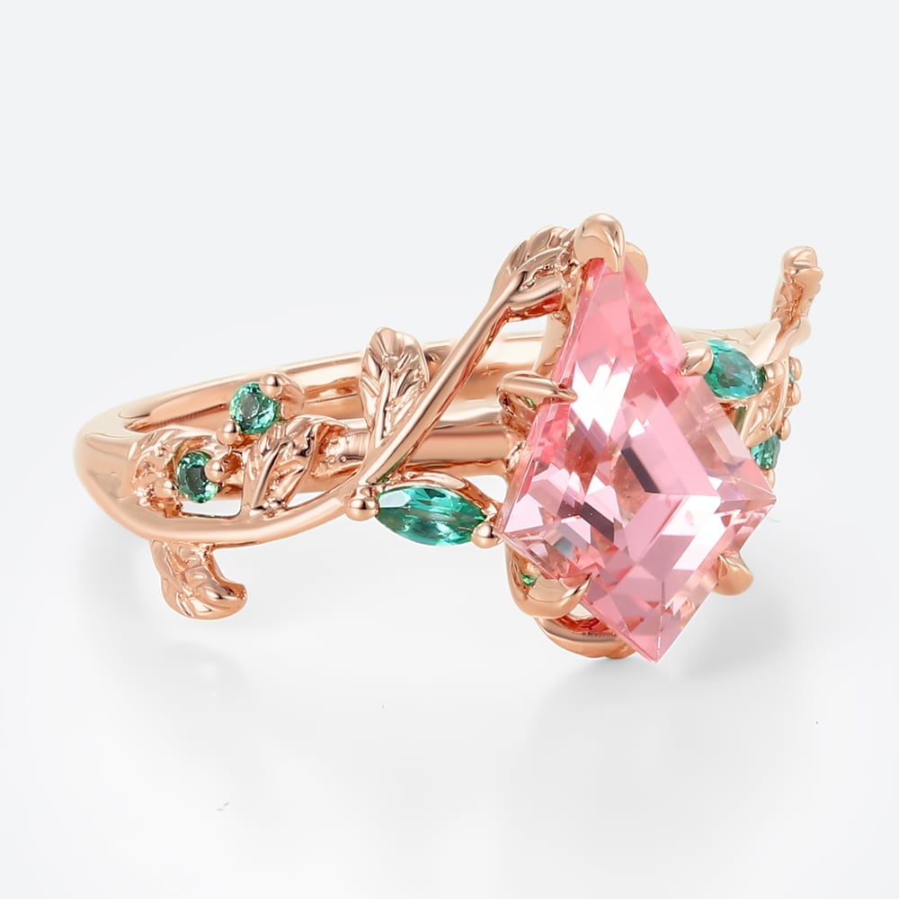 Kite Cut Pink Sapphire Nature-Inspired Engagement Ring with Emerald Leaf Accents in Rose Gold