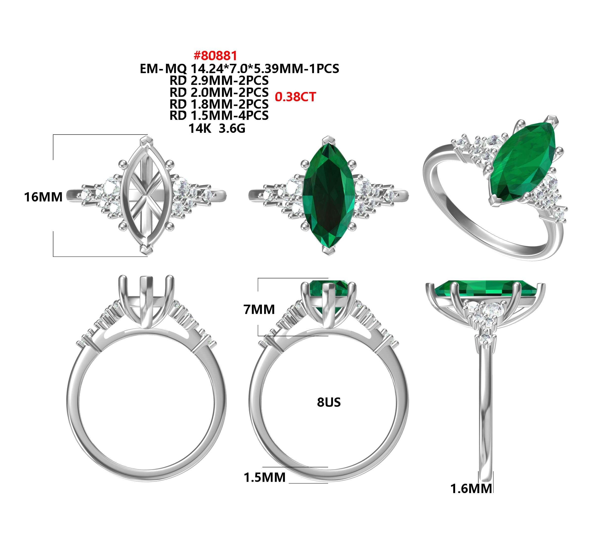 Center Stone Specifications: Marquise cut Emerald 14.24 × 7.00 × 5.39 mm ( customer provided )