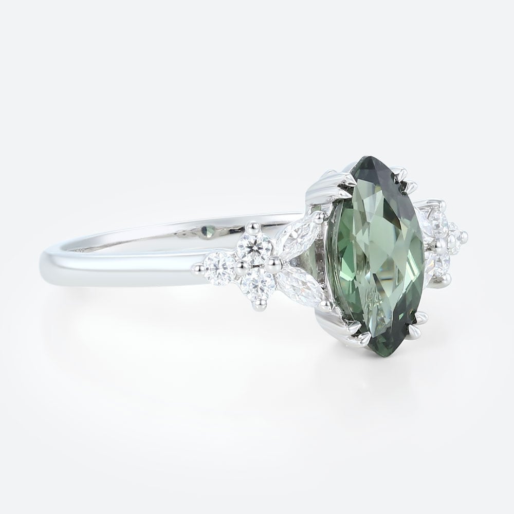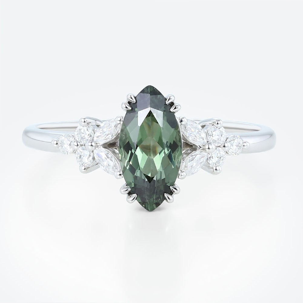 White Gold Round Cut Moss Agate Engagement Ring Marquise Moissanite Side Stone Ring