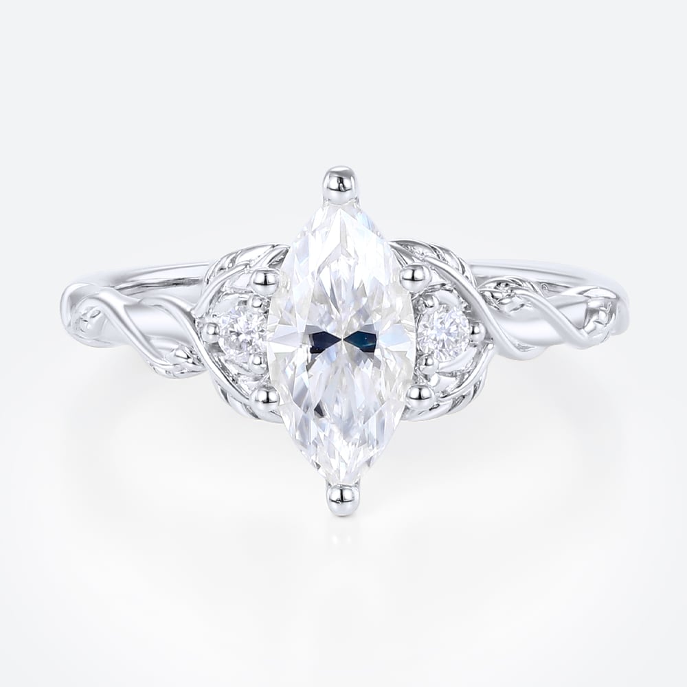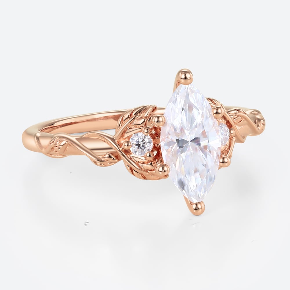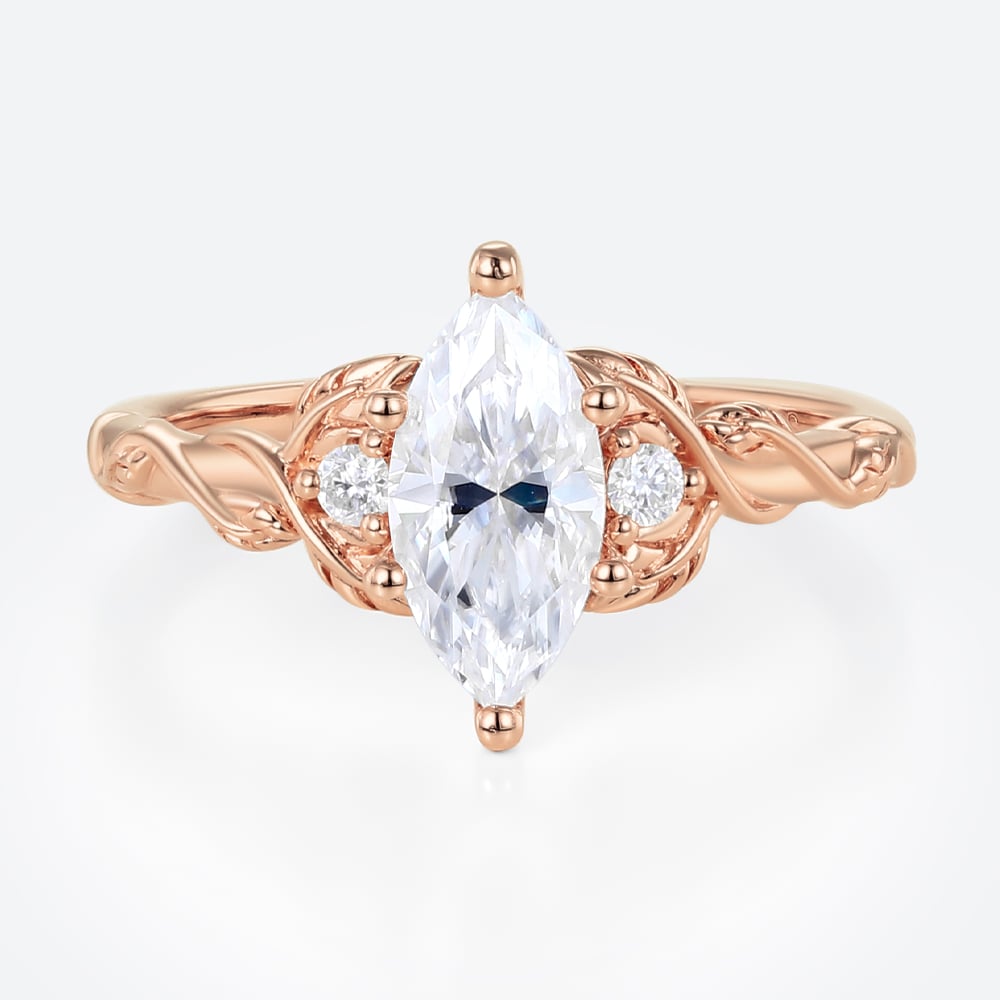 Marquise Cut Moissanite Three Stone Engagement Ring with Vine Detail in Rose Gold