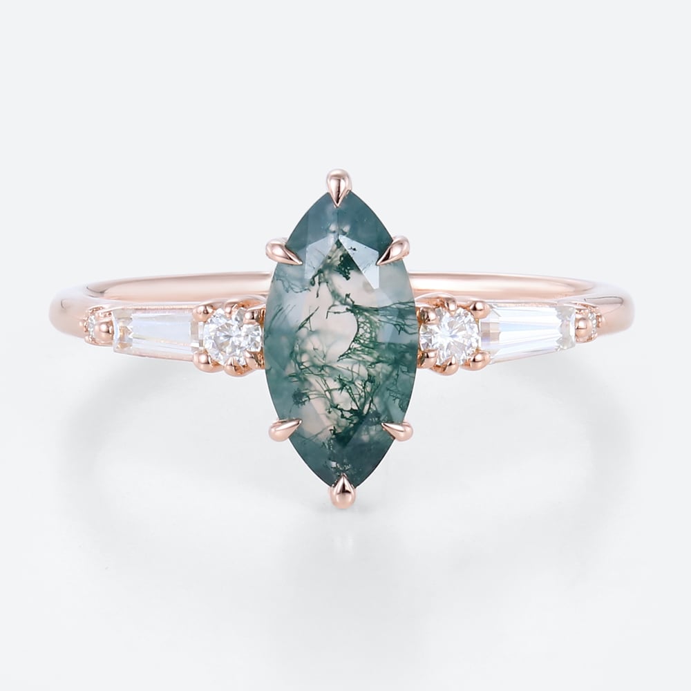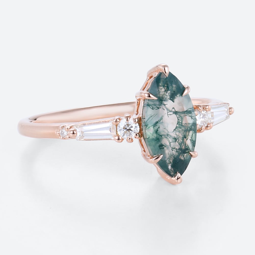 Marquise Cut Moss Agate Claw Engagement Ring Unique Bridal Ring in Rose Gold
