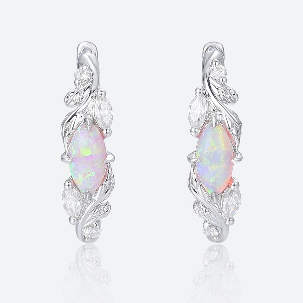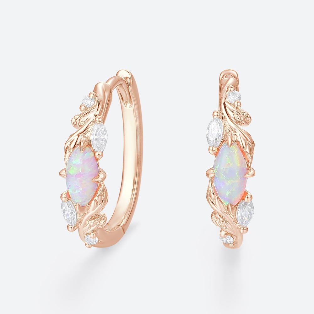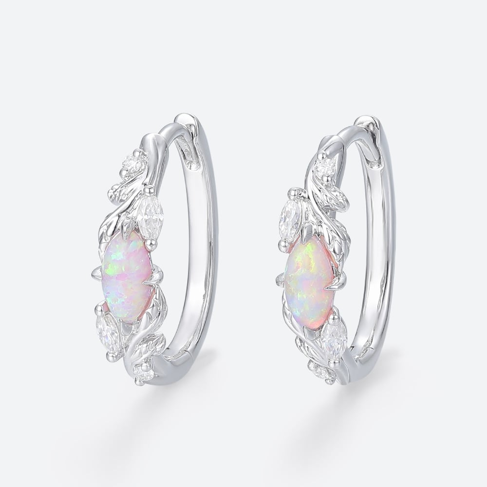 Marquise Cut Opal Enchanted Vine Huggie Earrings with Lab Diamond Accents in White Gold