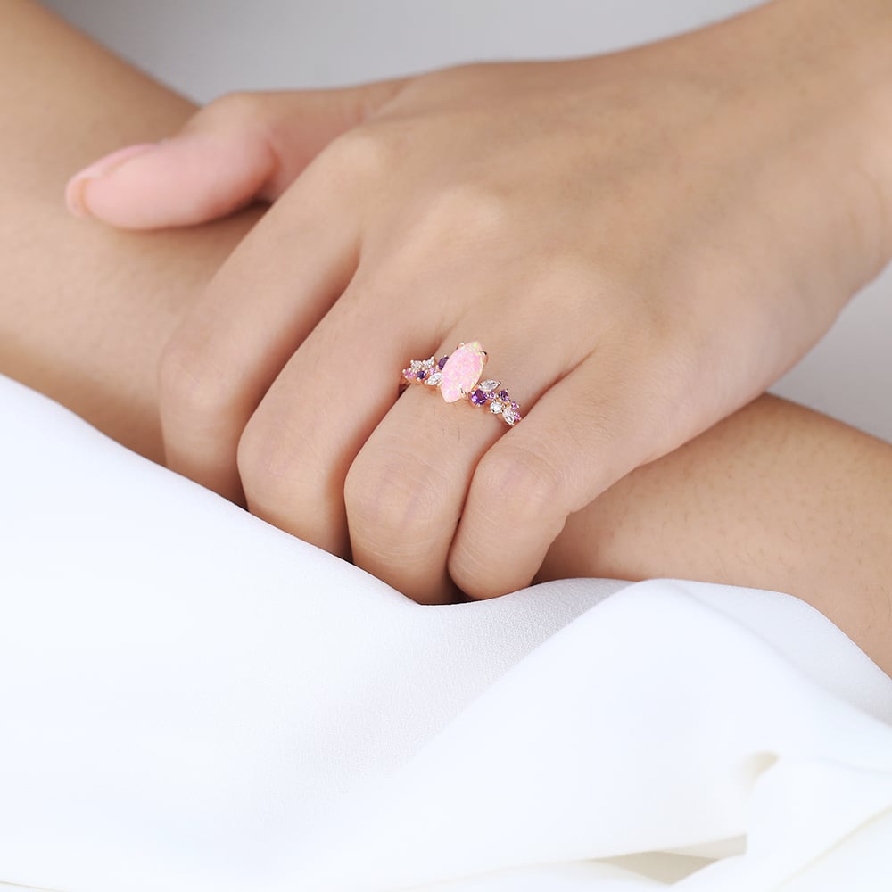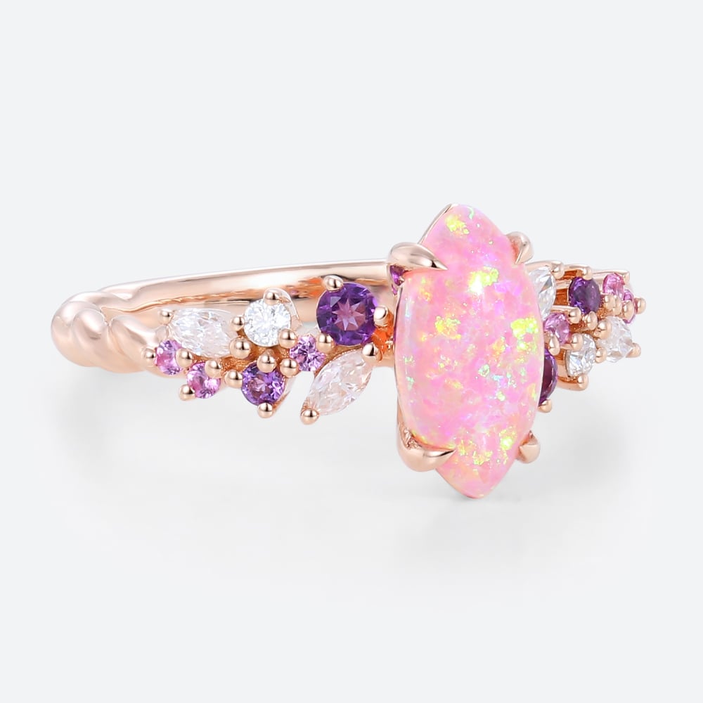 Marquise Cut Pink Opal 3/4 Twisted Engagement Ring with Multi Gem in Rose Gold