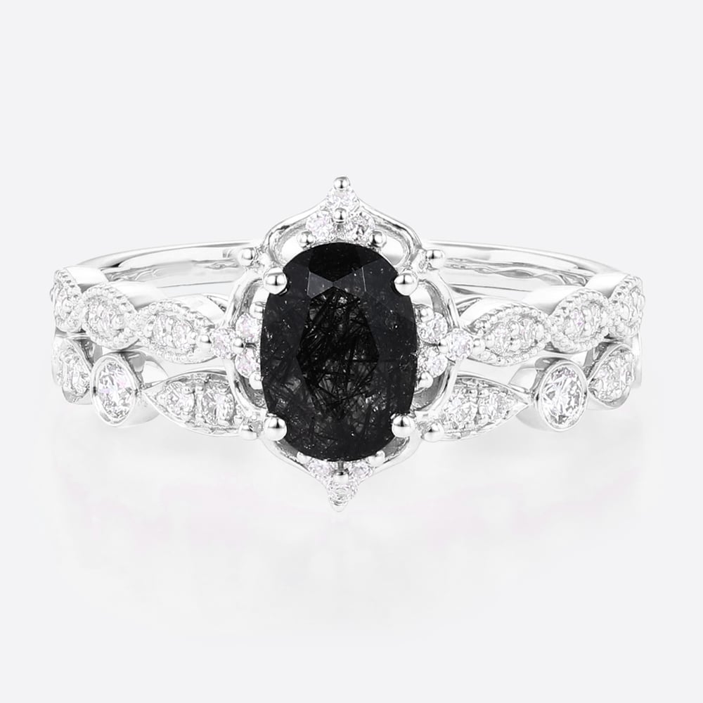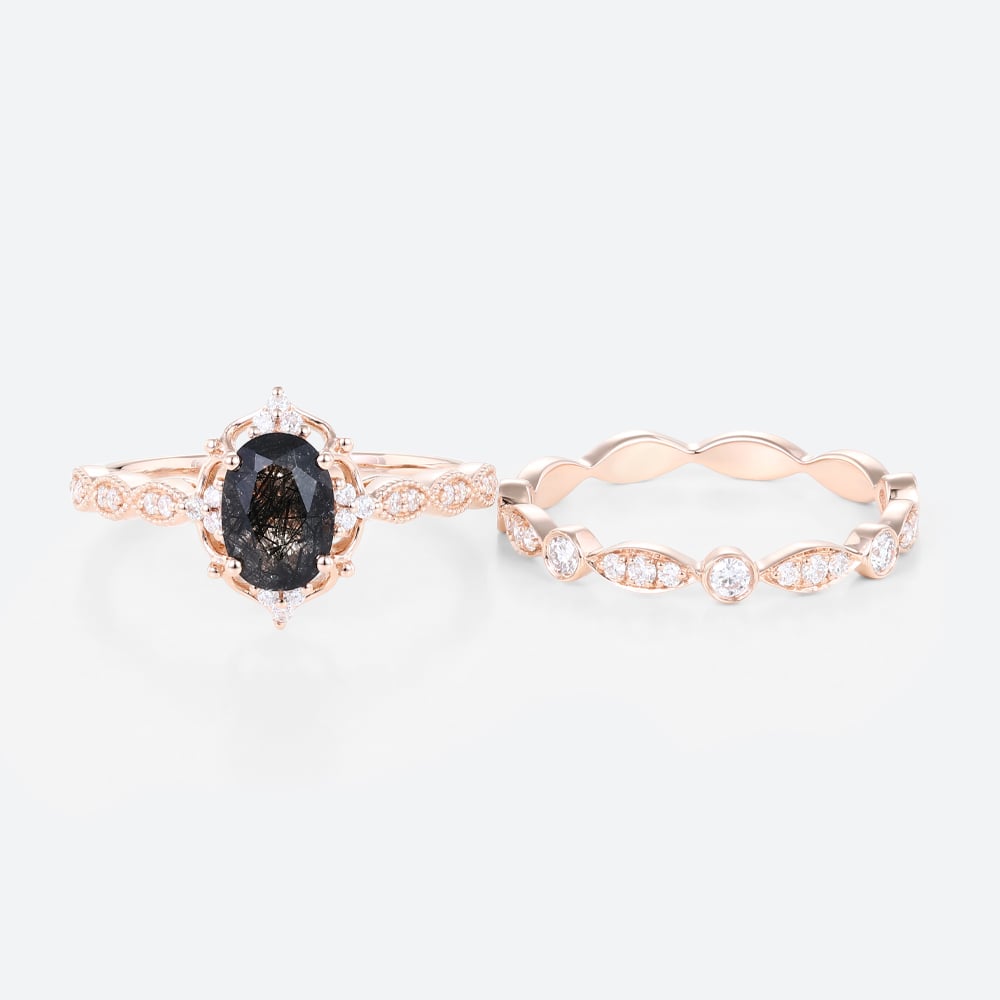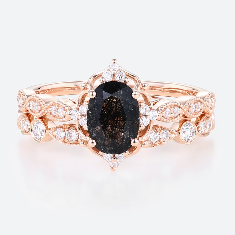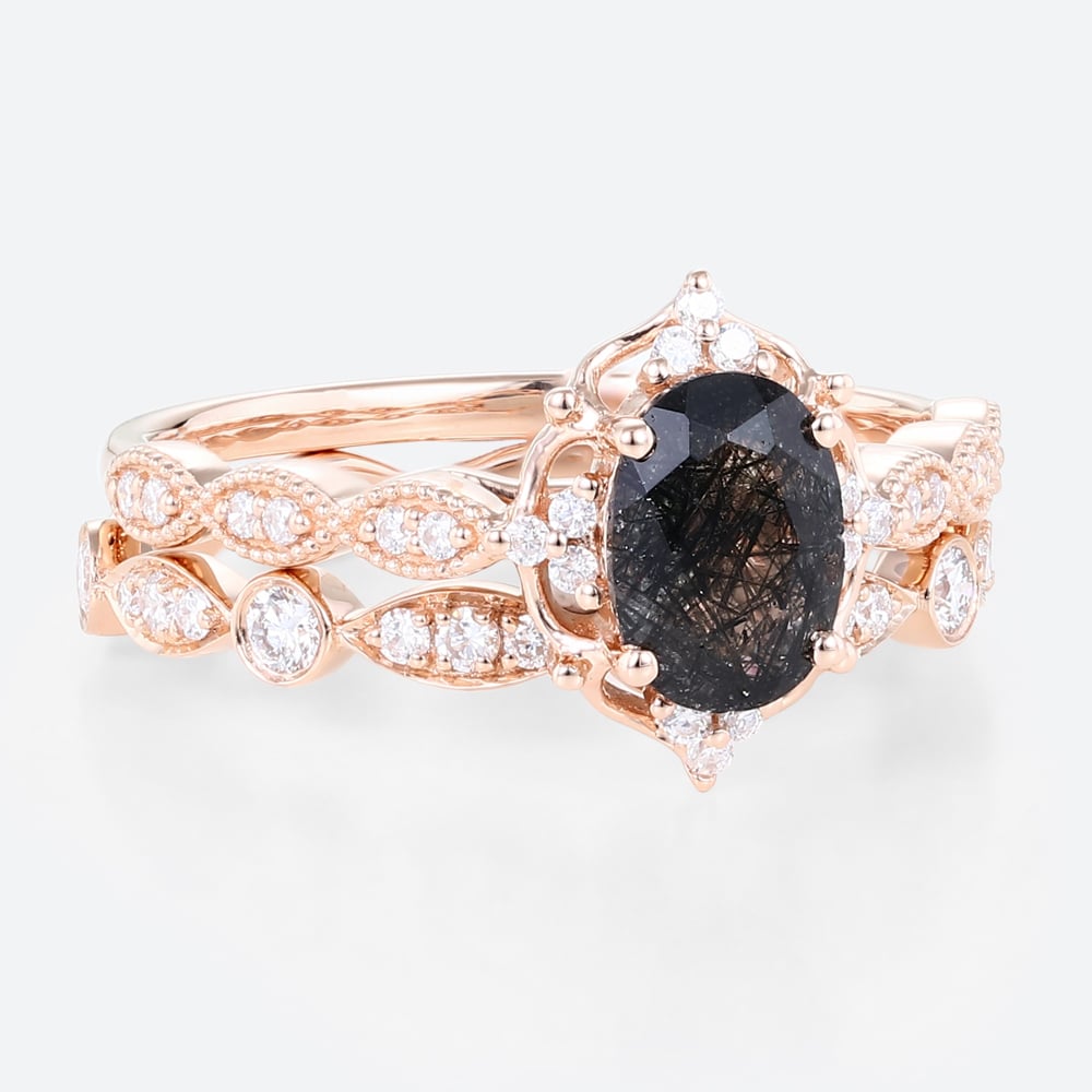 Oval Cut Black Rutilated Quartz Vintage Inspired Bridal Ring Set Elegant Engagement Ring in Rose Gold