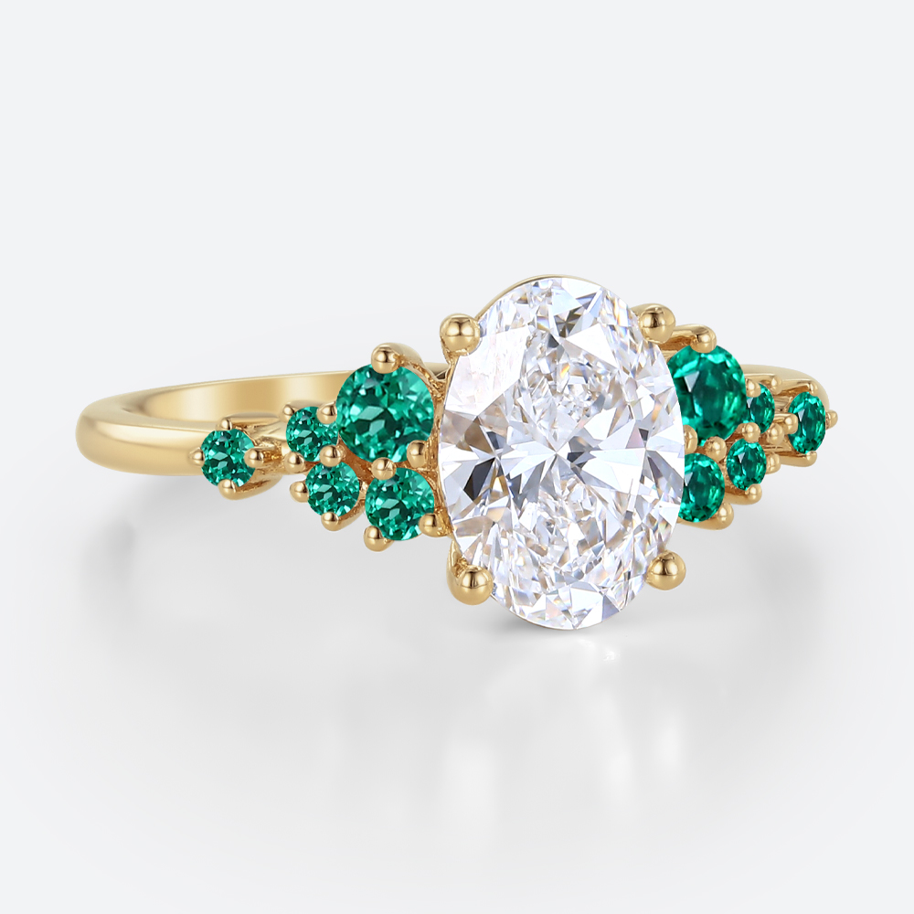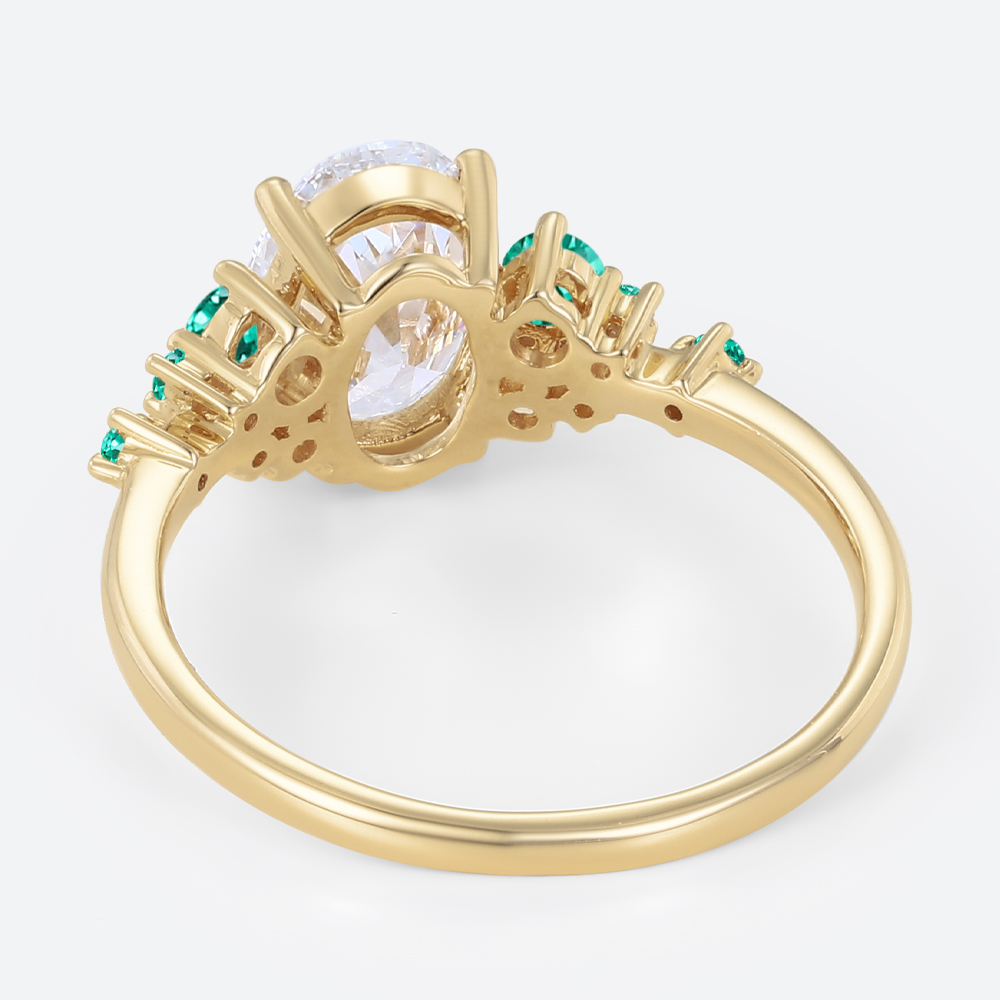 Yellow Gold Oval Cut Lab Emerald Engagement Rings Cluster Diamond Accented Rings