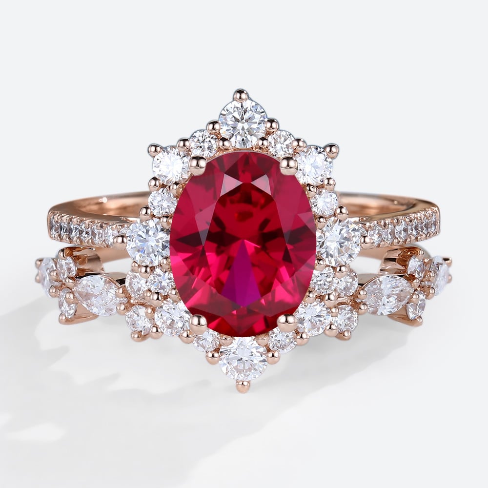 Oval Cut Lab Ruby Exquisite Bridal Ring Set with Straight Stacking Band