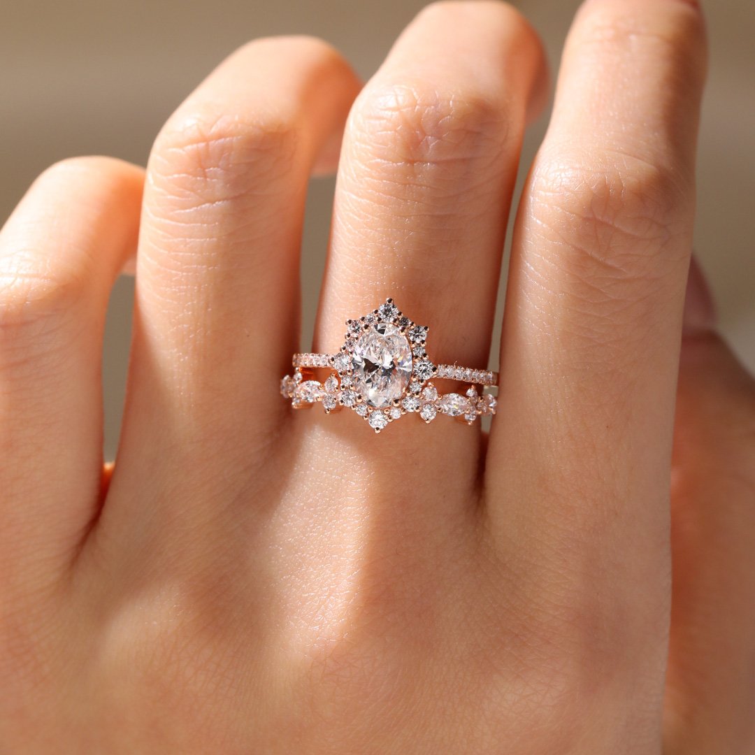 1ct Colorless VS+ Oval Cut Lab Grown Diamond Halo 4-Prong Engagement Ring Set in Rose Gold